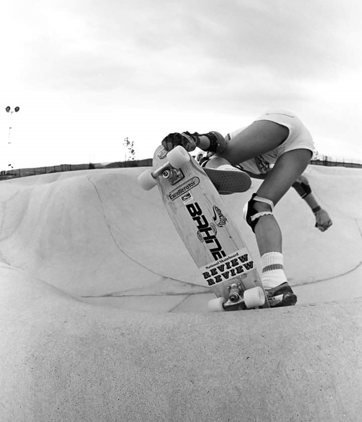 Judith was raised in North Miami and remembered scooting around the sidewalks on a skateboard with clay wheels on her belly as a child in the 1960s. Skateboarding was a fun toy, yet as she got older and as the design of skateboards improved, it became a whole new outlet. By Junior High, skateboarding was a means of adventure and escape, especially as her home situation had its challenges with her parent’s illnesses. “I was supposed to be playing tennis after school, but I’d be practicing my skateboarding in the tennis courts instead. We would find ravines, anywhere where you could ride an embankment – river drainages, underneath freeways was such fun.”