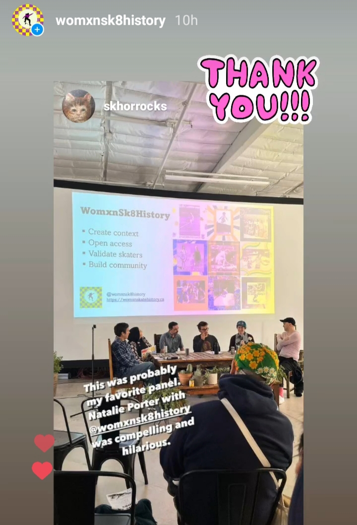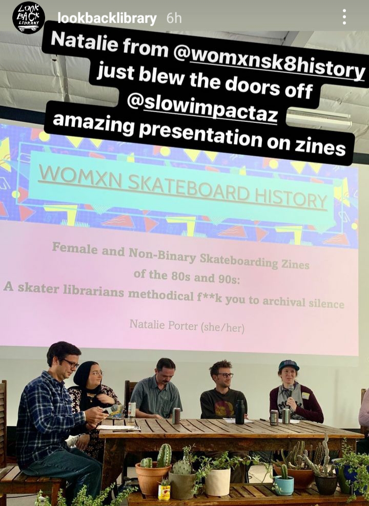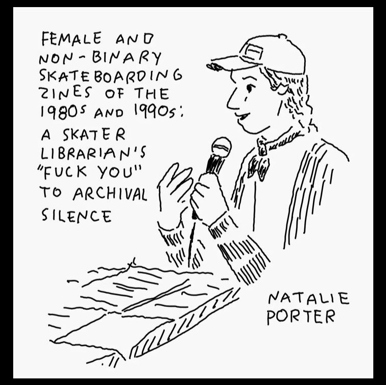 On the old Instagram, there were lots of stories and even snippets of the presentation in people’s posts. Eek! And, I was really excited to finally meet Kevin Marks of LookBack Library and John Freeborn of Tails of…Skateboarding zine, who I’ve bantered with online forever. Also made tons of new friends, including a super rad artist / graphic novelist named Sophie Yanow who sketched out the panelists (wow!) and when my taxi failed to show up, the loveliest skater named Tayler Krabbenhoft whisked me off to the airport. I love skaters!