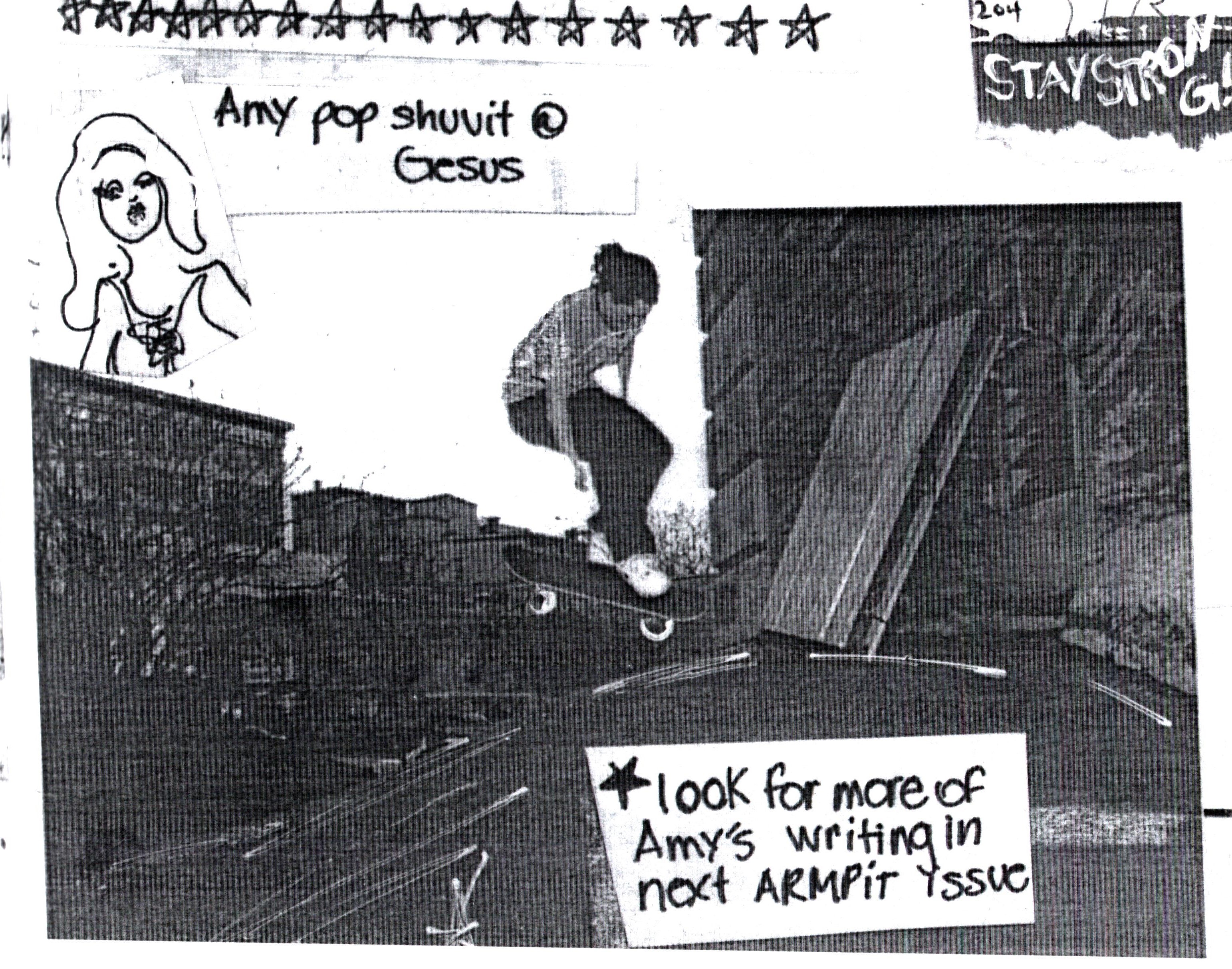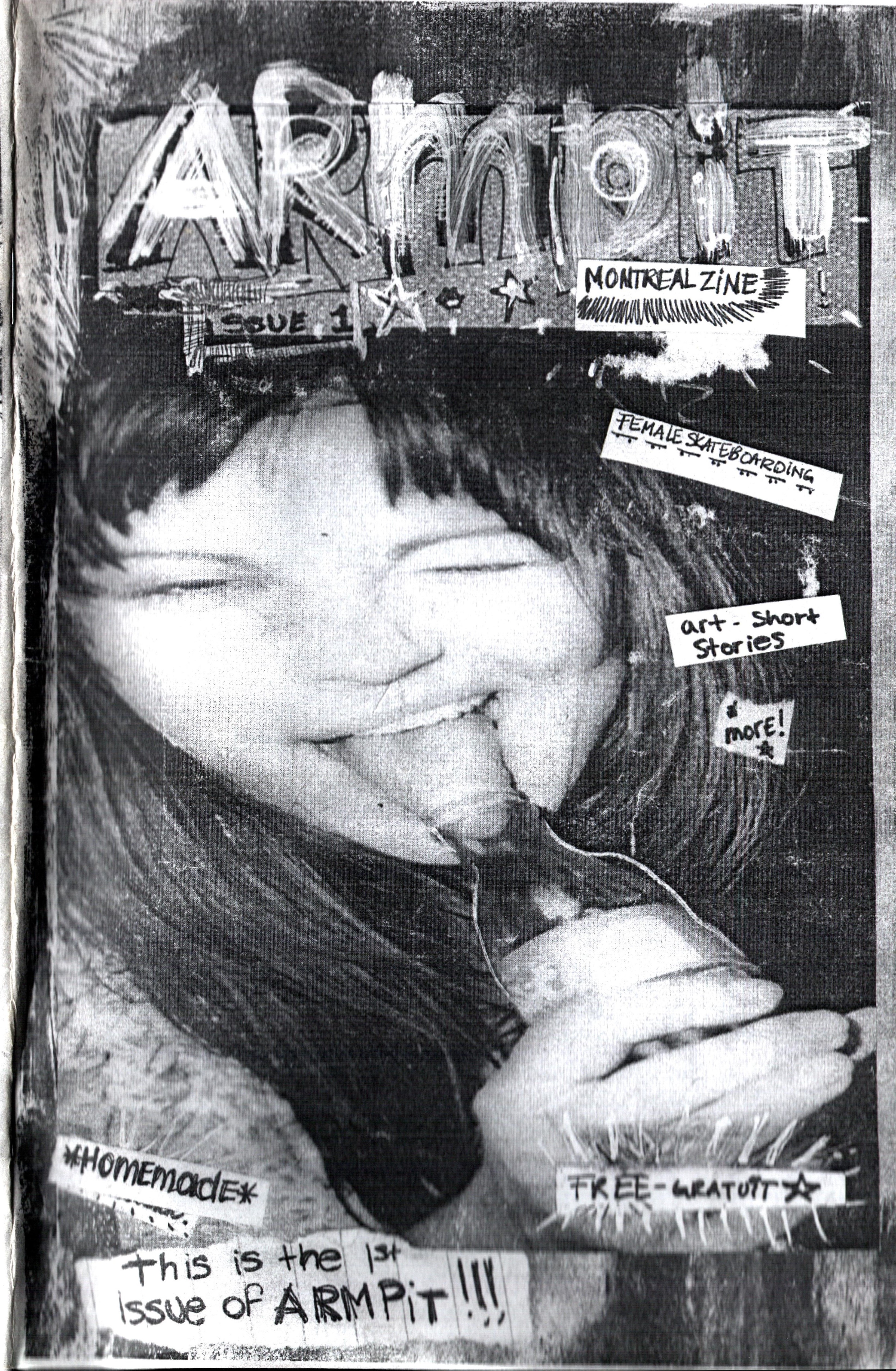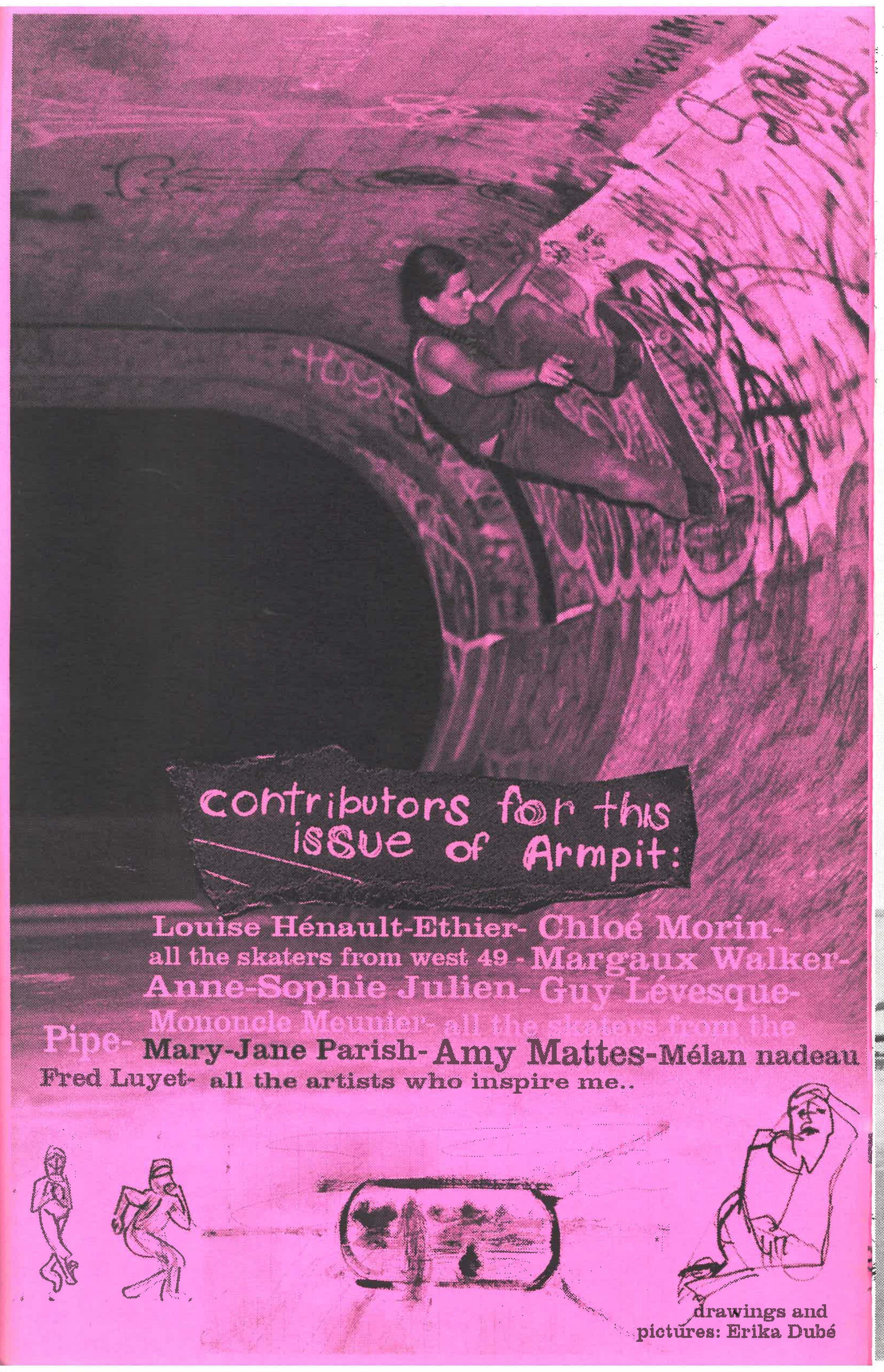 Armpit zine was the brainchild of Erika Dubé, a Quebecois skateboarder who had spent significant time in California, getting to know the crew behind the San Diego zine, Villa Villa Cola. Back in Montréal, Quebec, Erika determined that the local crew of female skateboarders, who would soon become known as The Skirtboarders in 2002, needed their own zine.