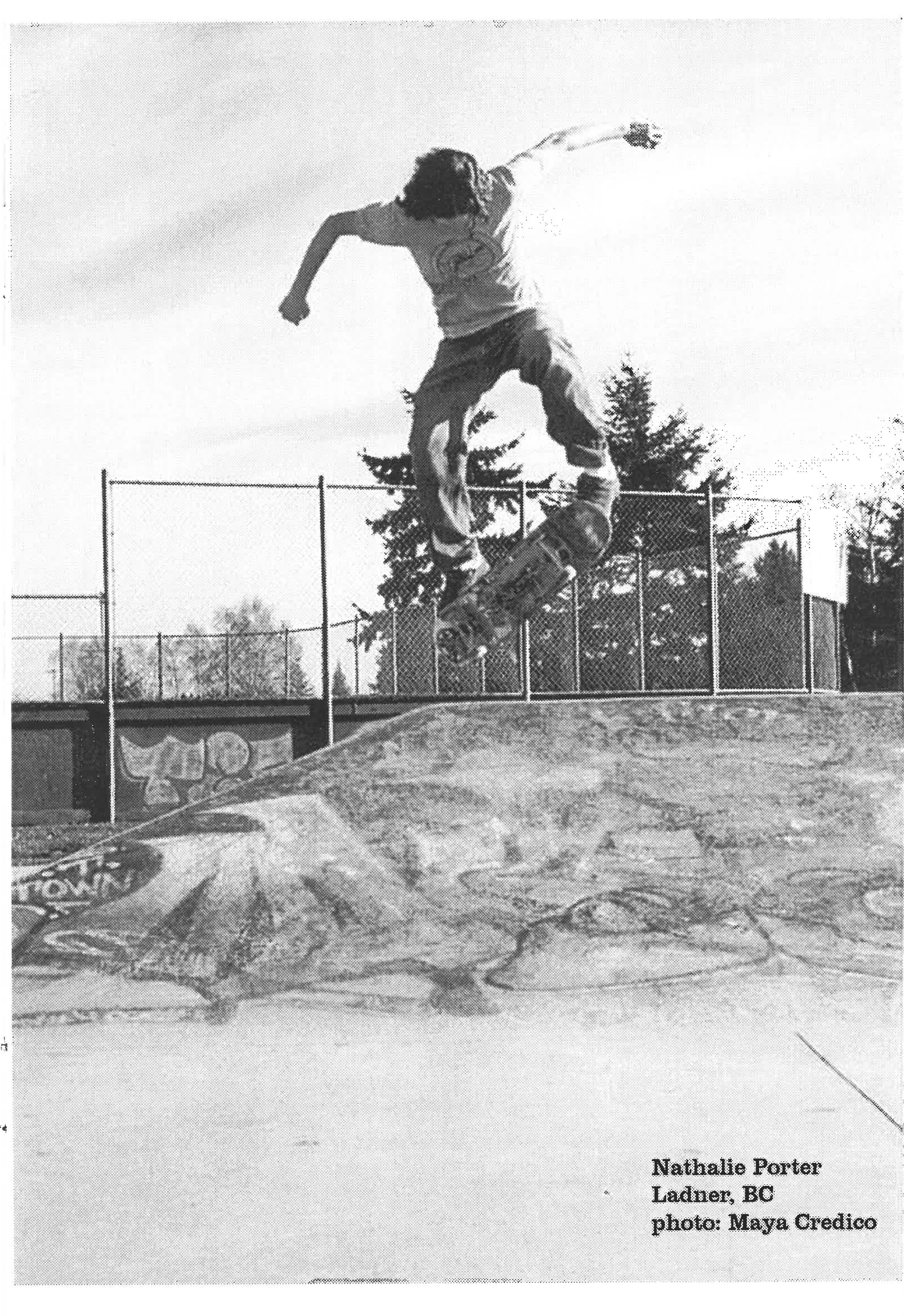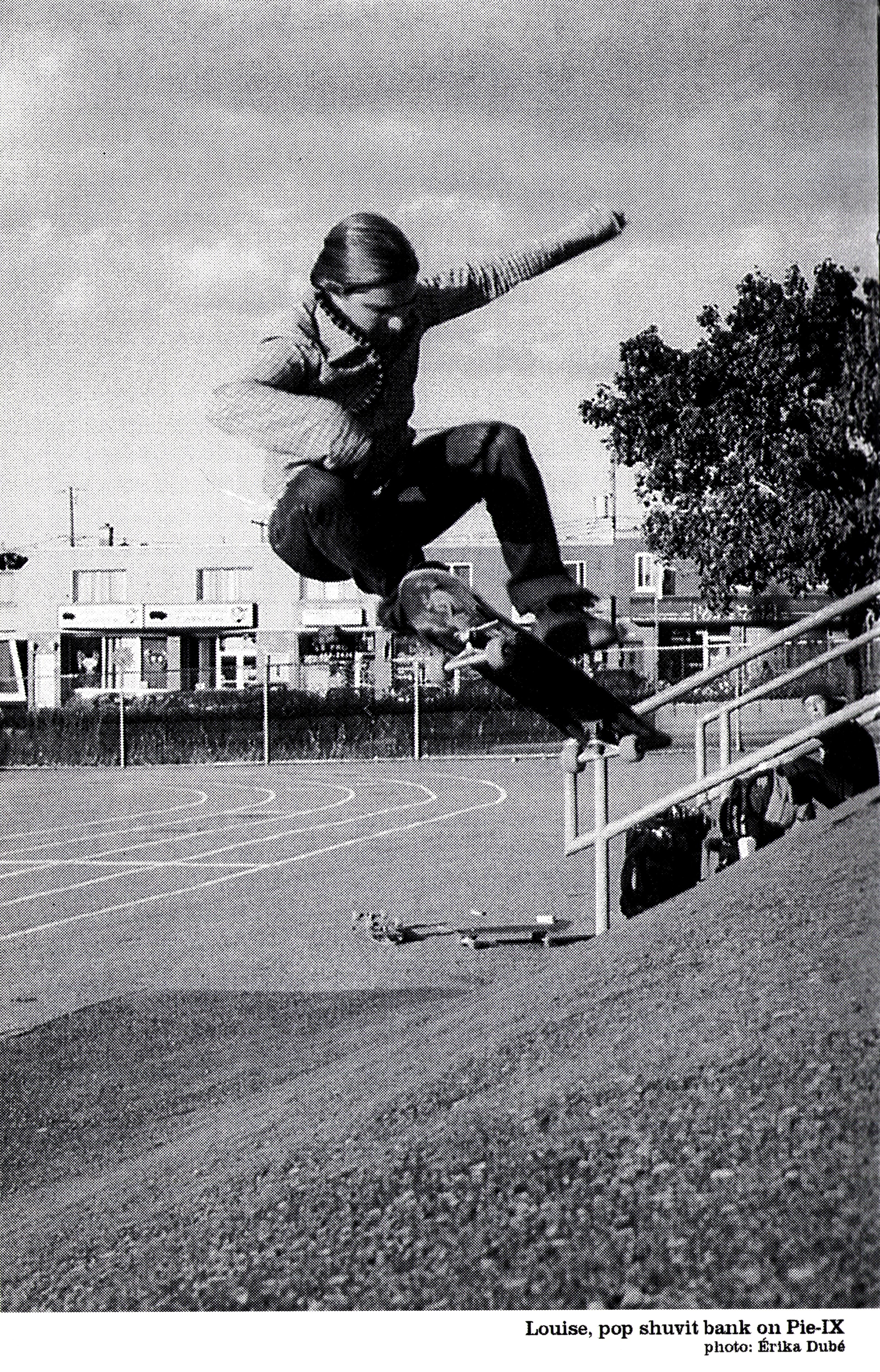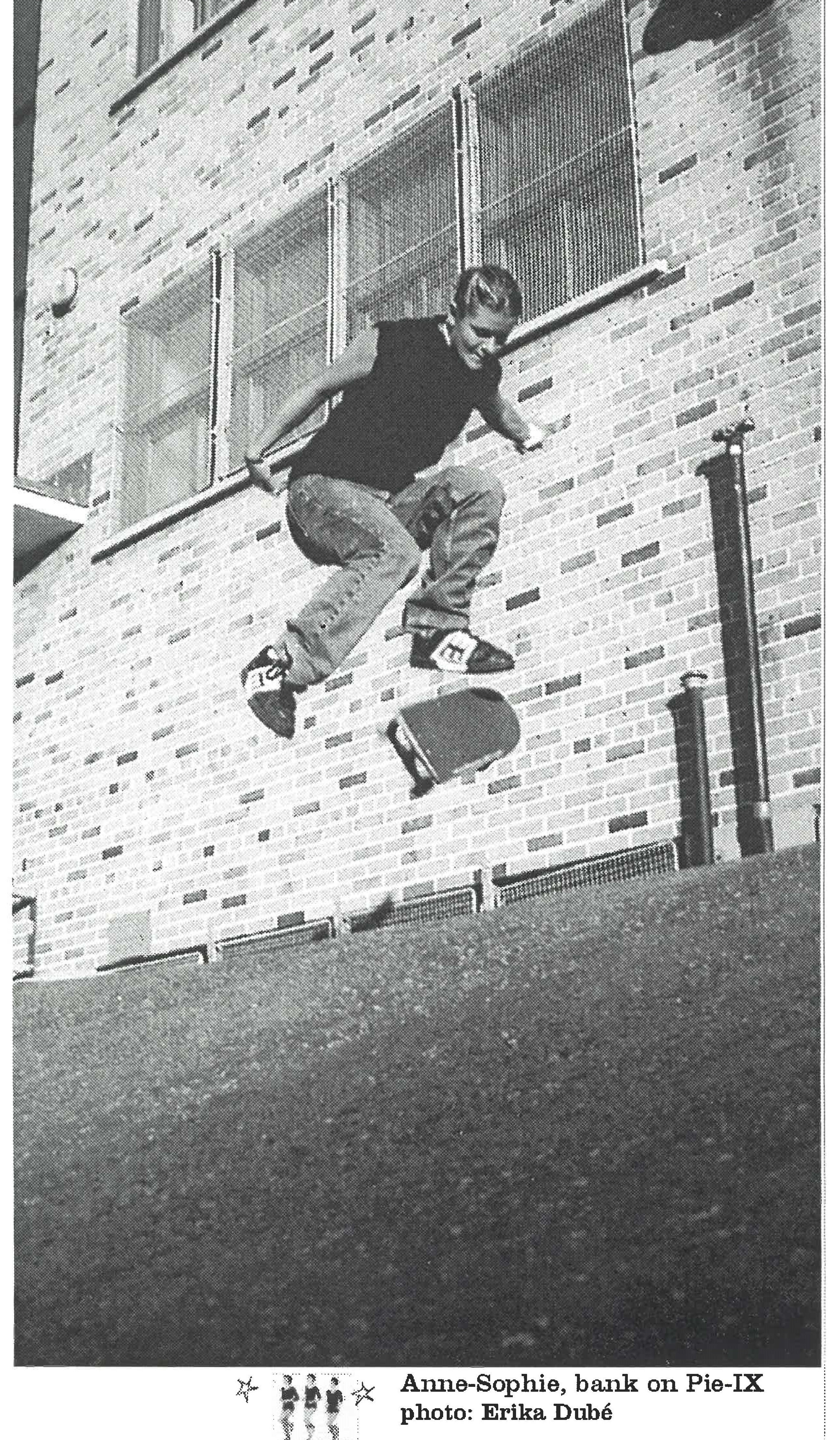 The first issue features photos of Margaux Walker at Berri park, photos and a rant about TransWorld magazine by Natalie (me), a roadtrip report by Louise Hénault-Ethier with Maya Credico and myself, creative writing by Maya, a review of an all-women breakdance crew called “Solid State,” photos of Amy Mattes at Gesus bank along with her poetry, more skate photos of Louise, Margaux and Mélanie Nadeau, a California memory by Erika (when she skated the Glory Hole in July 1999 with friends like Faye Jaime and Isabelle Ranger), artwork by Erika, a book review by Gabrielle Papillon.