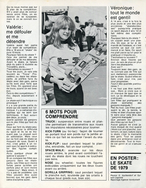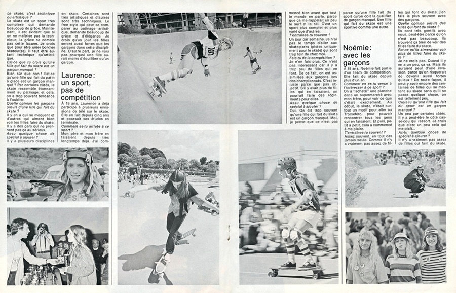The photos looked familiar, and then I remembered they were from an article called “5 filles et 5 skates” had appeared in the French magazine Djin in 1978, which acknowledged the demonstration in Paris from September. While the Dutch girl wasn’t interviewed for the magazine, five other French girls were: Pascale ? (22), Laurence Lannes (18), Naomi Harris (15), Valerie ? (18), and Veronique (14).