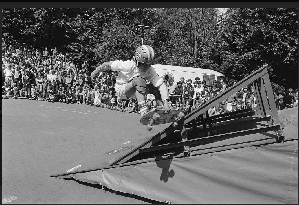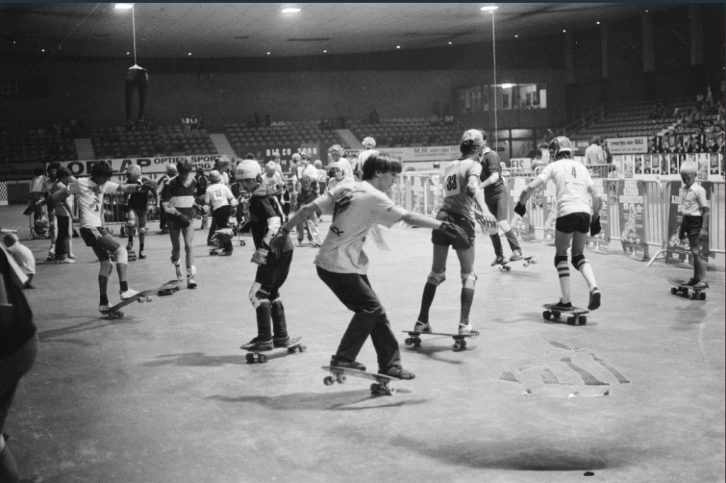 The Netherlands Skateboard Championship was advertised as coming up that weekend at Jaap Edenhal in Amsterdam, which is an ice rink named after a Dutch athlete. The venue has also hosted music concerts from ABBA, Bob Marley, Iron Maiden to Run-DMC. It was anticipated that, “About a hundred boys and girls will compete for honors in two categories: slalom and freestyle. Visitors pay 2.50 guilders entrance fee.”