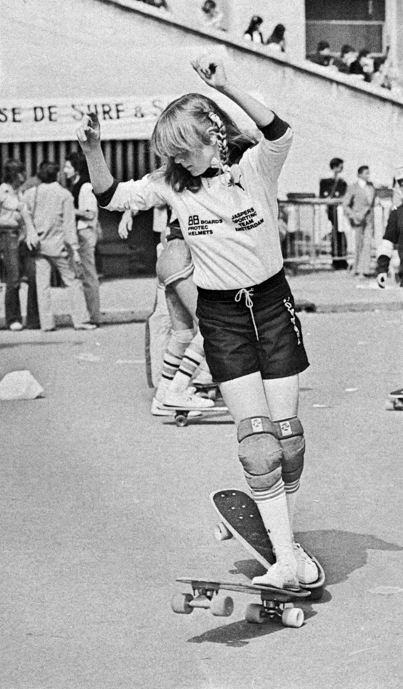 I continued to dig in the hopes of finding a photo of Laura and I came pretty close while reviewing the Facebook page of Claude Queryel, the leading skateboard historian from France who runs the Endless Lines website. I had searched his photo albums using the words “filles” and “femmes,” when a photo of a mystery skater appeared. The caption stated, “Skater of Team Amsterdam, Paris International Championships, organized by the F.F.S.S. [French Skateboard Federation], Levi’s [jeans], and Europe 1 [radio station], September 16-17 1978.” Claude also posted a photo of the mystery girl skating freestyle.