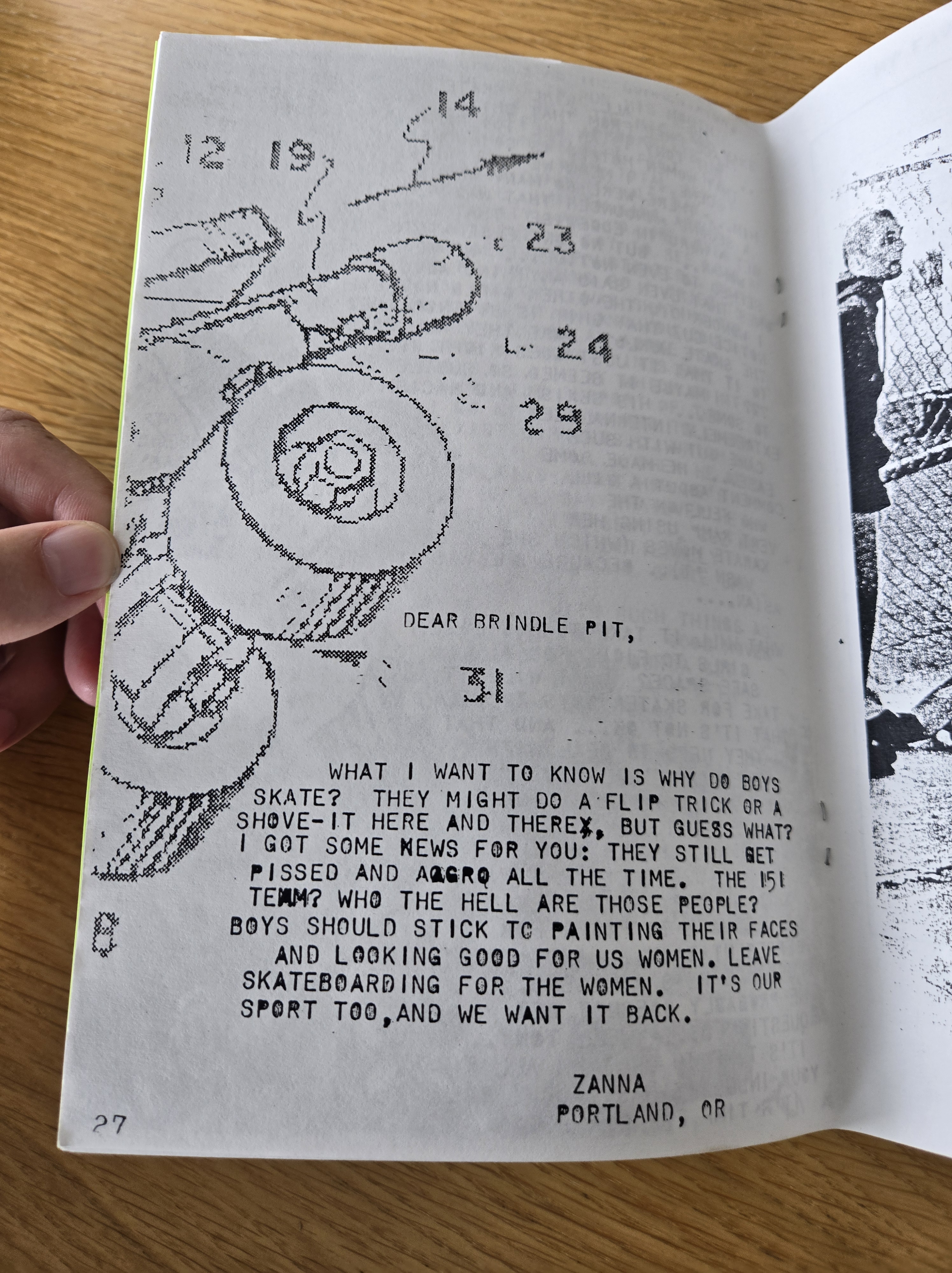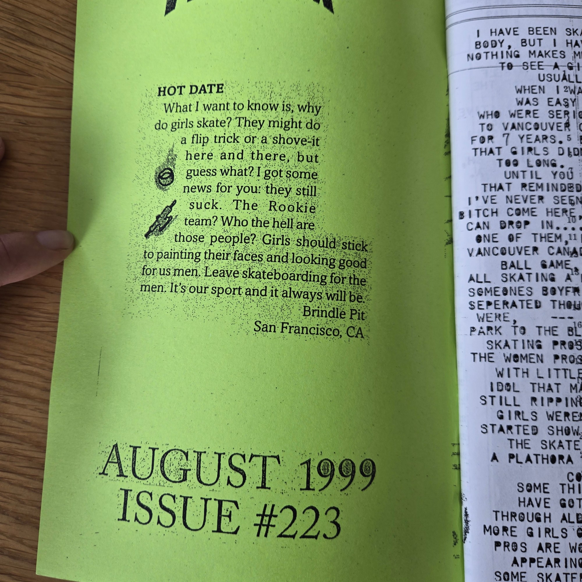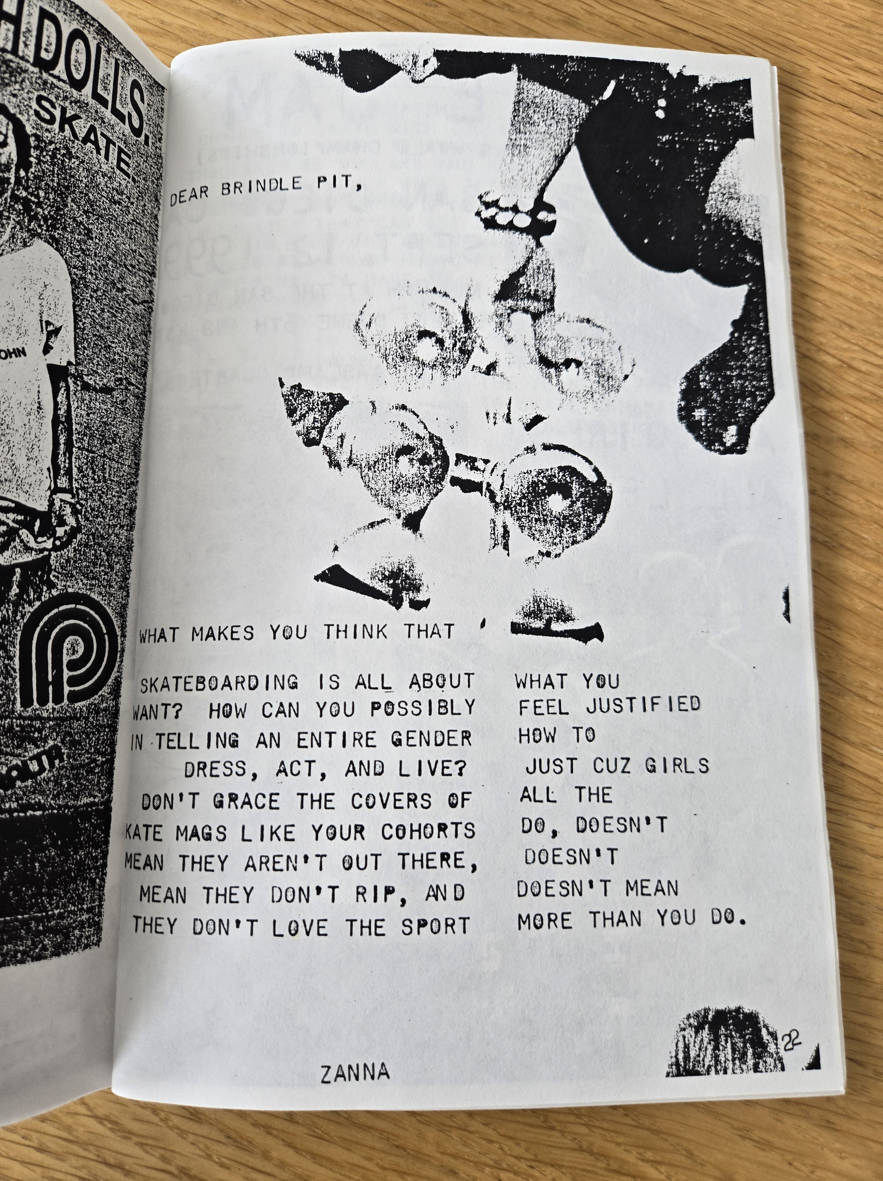 On the very first page, Zanna highlighted a scathing letter from the Mailbox page of Thrasher from August 1999 (issue #223) that condemned women skaters, in particular the Rookie team.