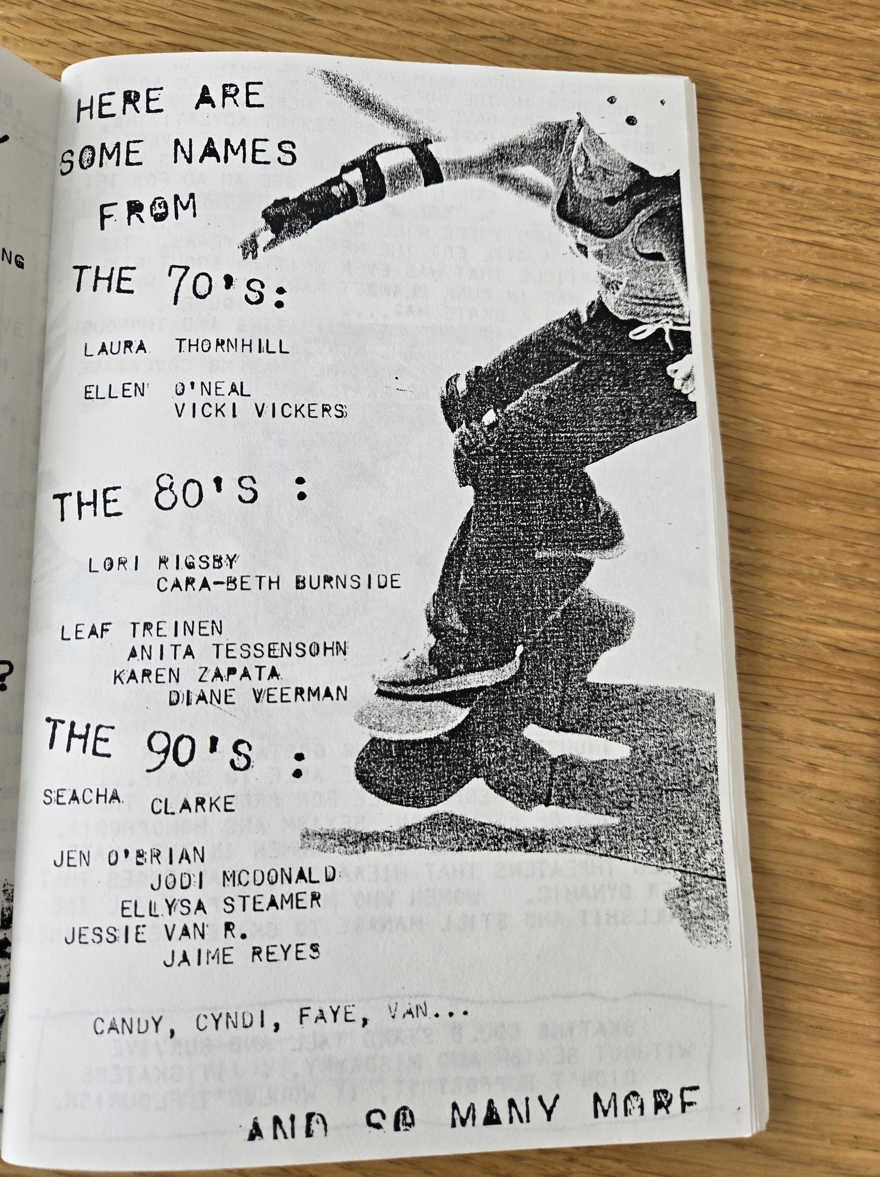 The zine included a critique of the book The Concrete Wave – the history of skateboarding from 1999 by Michael Brooke. And when Zanna wrote, “There’s enough girl skaters in history to write a whole book about them… but where is all the documentation?” (5) I got shivers! I’ve always felt the same way, and this kind of cry in the dark from 1999 really motivates me to keep going with this archive. Zanna then listed some names that now have bios on the site!