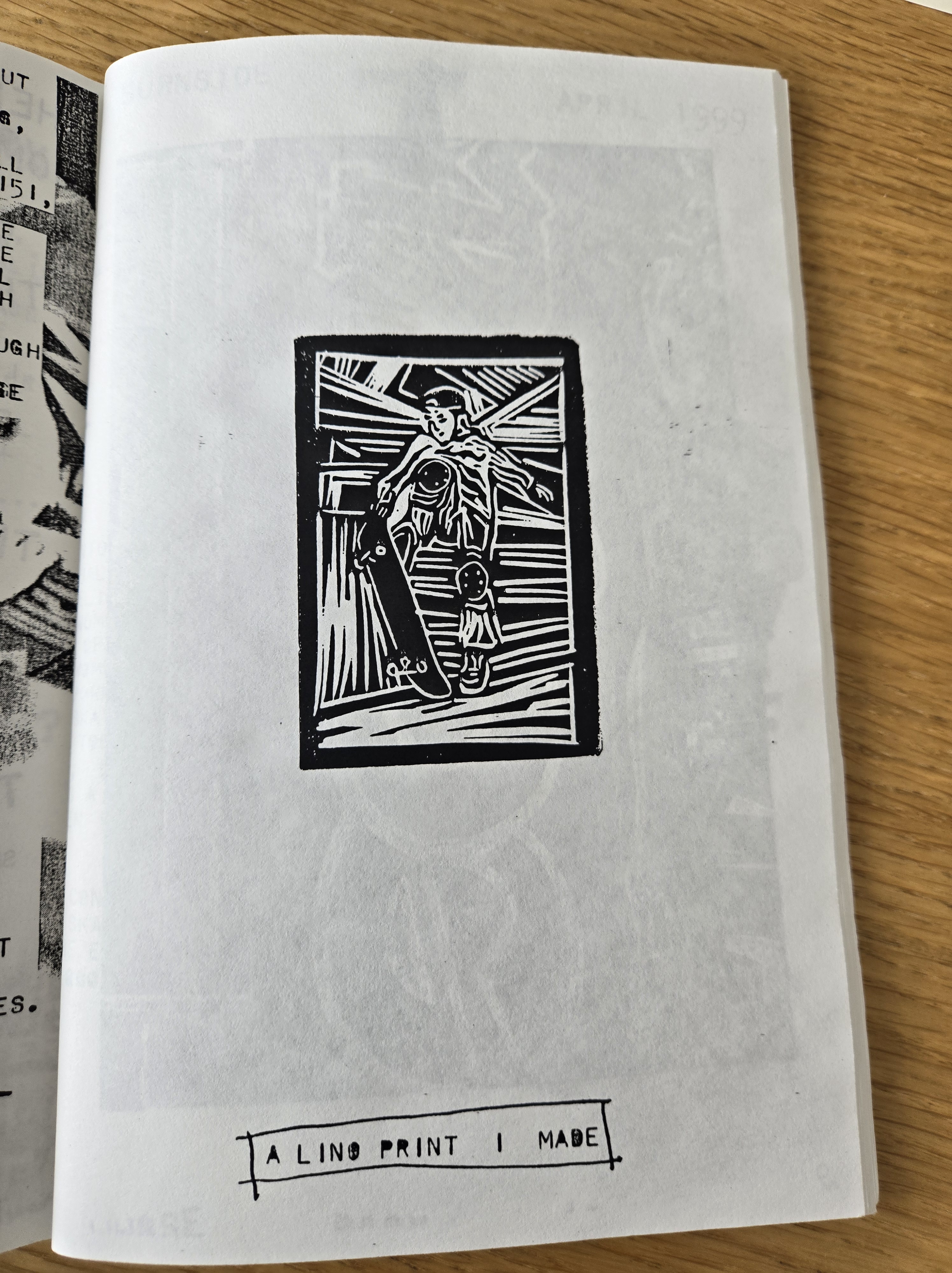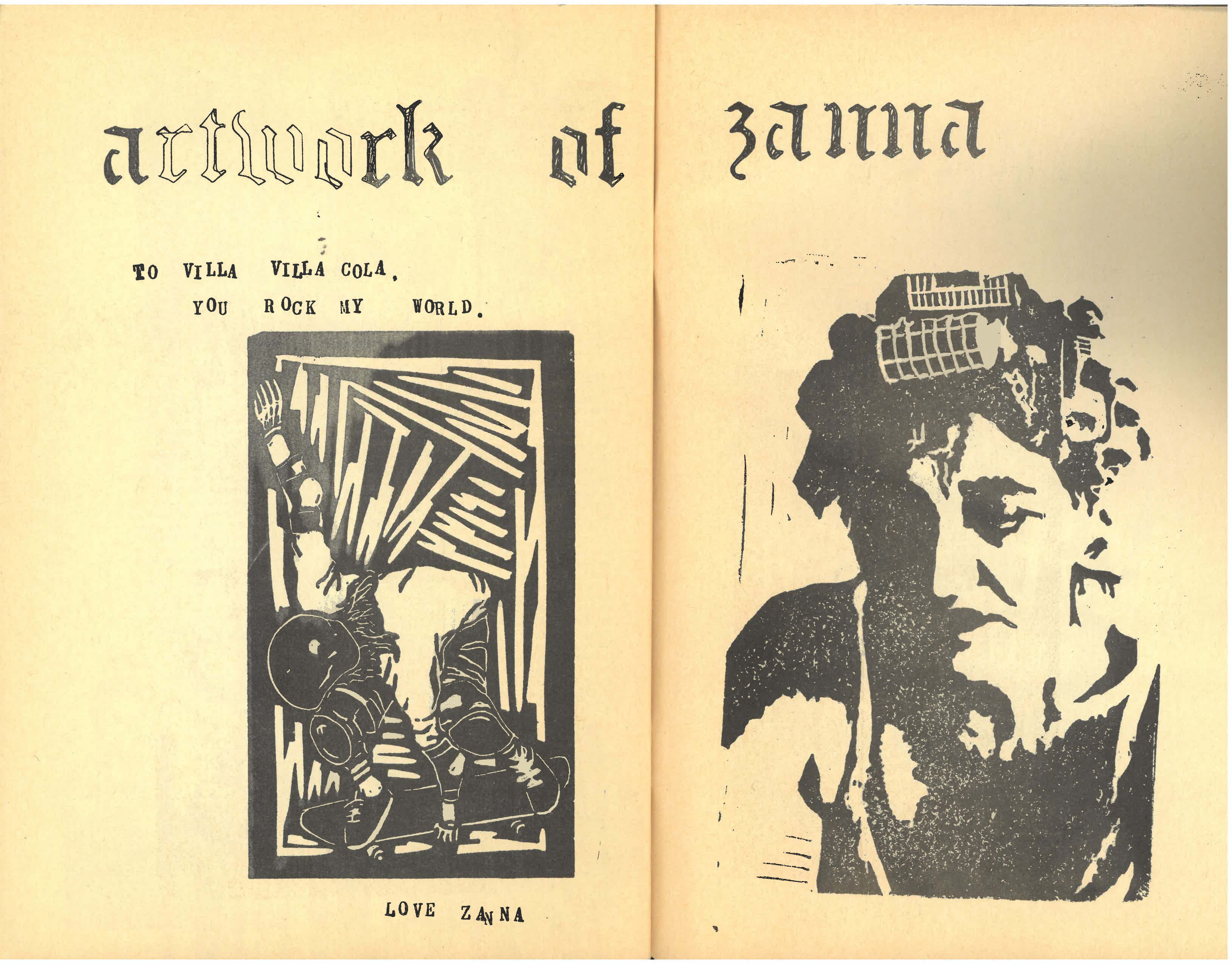 Throughout 50-50: skateboarding and gender, Zanna includes really cool lino cut artwork and in issue 4 of Villa Villa Cola (1998) Zanna’s artwork was featured. The Villa Villa Cola zine was created by twin sisters Nicole and Tiffany Morgan, and their crew of friends based in San Diego starting in 1997, and Zanna was a big fan of the production.