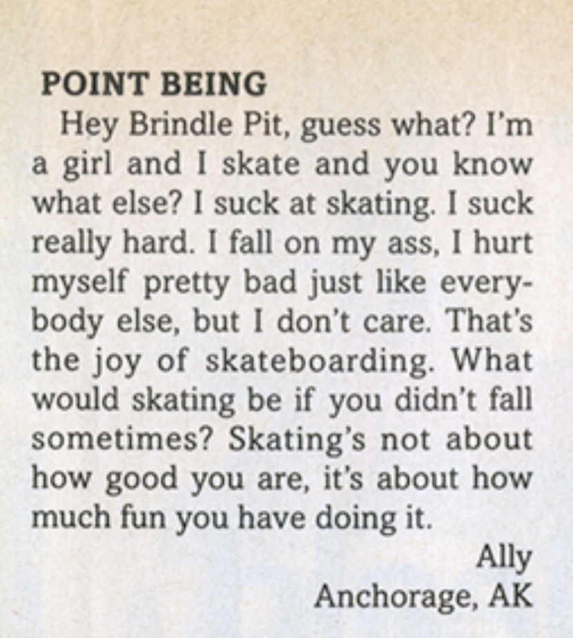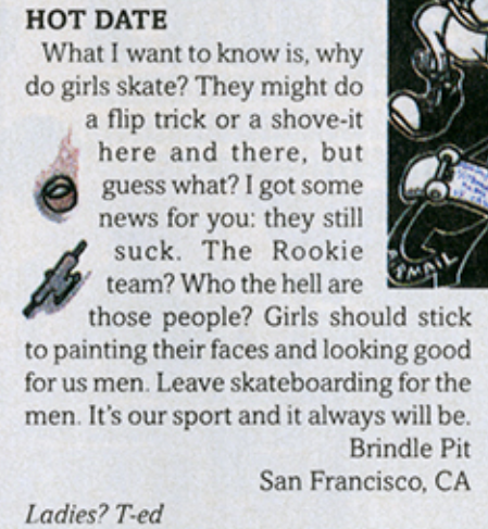 The letter captured the attitude that many young, entitled cis male skaters had in the 1990s and reveals what young women were up against. “Brindle Pit” of San Francisco wrote “What I want to know is, why do girls skate? They might do a flip trick or a shove-it here and there, but guess what? I got some news for you: they still suck. The Rookie team? Who the hell are those people? Girls should stick to painting their faces and looking good for us men. Leave skateboarding for the men. It’s our sport and it always will be.”