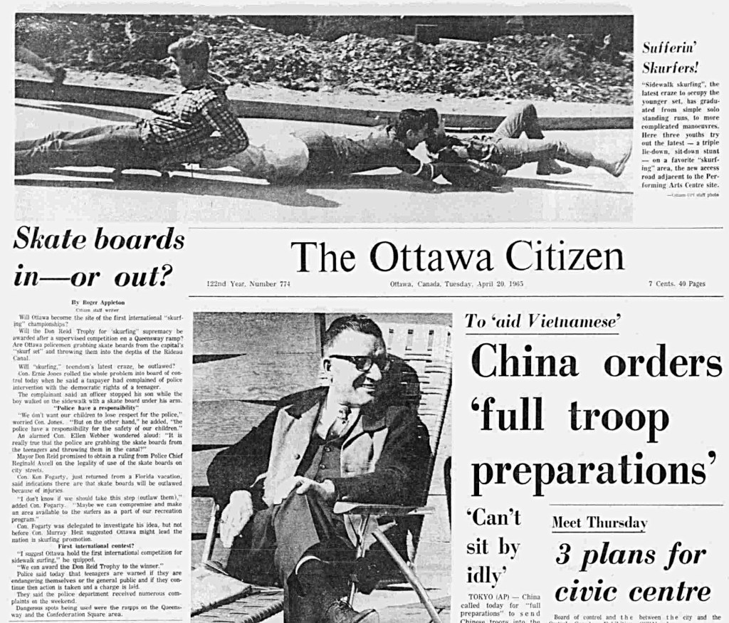 April 10th: “Sidewalk surfing latest mania” by Dennis Foley, who explains that skateboarding emerged three years prior in the U.S. and how 10 “skurfers” were taken to hospital in recent days, meanwhile all the sporting goods stores were sold out of skateboards and orders were only being partially filled because the demand is so great. There was a warning for skurfers to keep off of Parliament Hill and an announcement of the national championships in Anaheim the following month, May 1965.