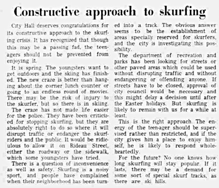 April 24th: “Skurfing” is the title of a letter to the editor by Barbara Edwards, Grade 9 of Rideau High School in Ottawa. Barbara said, “I disagree with the statement you printed that the Ottawa police don’t have anything against us teen-agers skurfing. If this is so then why do they take away our skurf boards, or even worse, our skurfing haven? All we want to do is have a little bit of fun… the police stop us and give us a lecture… If they are not against us then why do they do this?”