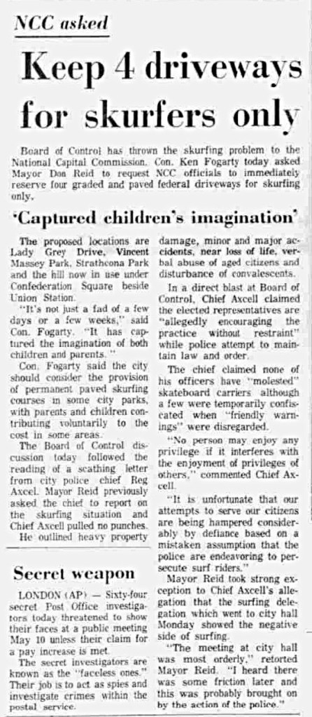 April 20th: “Skateboard in—or out?” by Roger Appleton, who reports on rumours of police throwing boards in the Rideau Canal and Mayor Don Reid’s promise to obtain a ruling from Police Chief Reginald Axcell on the legality of skateboard use. Constable Fogarty wondered, “Maybe we can compromise and make an area available to the surfers as part of our recreation program?” Constable Murray Heit even wondered if Ottawa could hold the first international competition for sidewalk surfing.