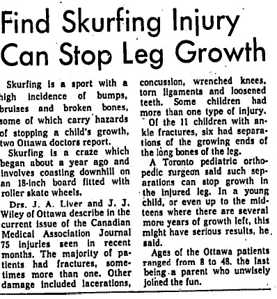 A month later, in the Globe & Mail from September 22, 1965, an article called, “Find Skurfing Injury Can Stop Leg Growth,” made a dramatic claim. Two Ottawa doctors believed that “skurfing” could stop a child’s growth because of the potential for injuries. “Drs. J.A. Liver and J.J. Wiley of Ottawa describe in the current issue of the Canadian Medical Association Journal 75 injuries seen in recent months… Of the 11 children with ankle fractures, six had separations of the growing ends of the long bones of the leg… such separations can stop growth in the injured leg.” But then they admitted that the patients ranged “from 8 to 48, the last being a parent who unwisely joined the fun.”