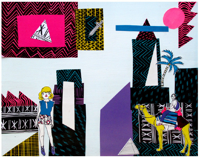 Artwork above: “Balancing Act” sculpture (reminds me of the Girl skateboards OG wooden dolls), collage from 2010 and collage for Nylon magazine, early 2000s.