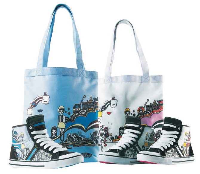 “Keren Richter’s illustrations of creepy-cute mod girls and ethereal dreamscapes have graced many gallery walls, advertisements and products. In fact she’s such a hit Vans asked her to design another shoe for their spring collection, following the success of her first pair last fall. The Wellesley skate shoe comes in two colorways, purple or pink, and features an illustration inspired by Keren’s San Francisco youth on the canvas exterior and a brightly colored mosaic print lining inspired by Islamic textiles and stained glass. Also launching with her shoe is a spring tote bag boasting the same durable canvas and whimsical design as the Wellesley. Keep an eye out for Keren later in the month, as she tours the country promoting her designs at various Vans stores.”