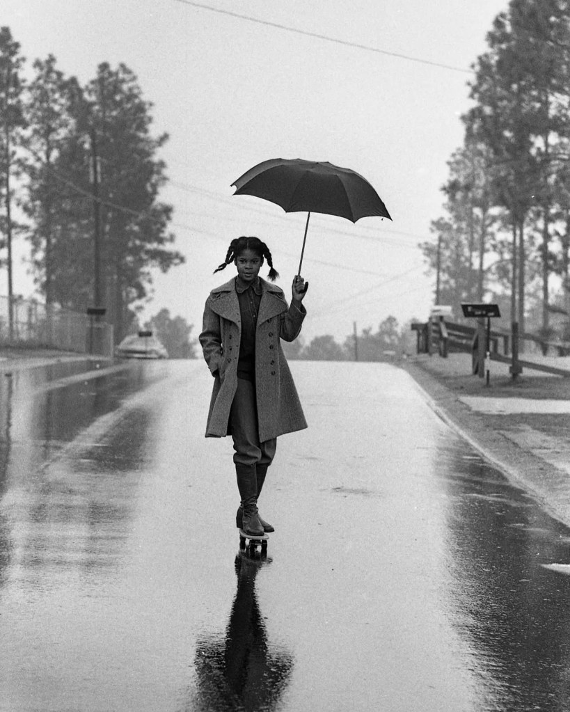 F.T. Norton reported that Shaunda was ten-years-old when the photo shoot happened. “Shane clearly remembers that day many moons ago when Aldridge, the photographer, spotted her atop the skateboard her uncle bought her and asked her to hold an umbrella” (Norton). These ruling uncles even provided skateboards for Shaunda’s friends! In Jeremy’s report, Shaunda shared that Aldridge lived across from her on Dinsmore Drive and asked permission from her grandparents for the photo, and suggested the umbrella as a prop.