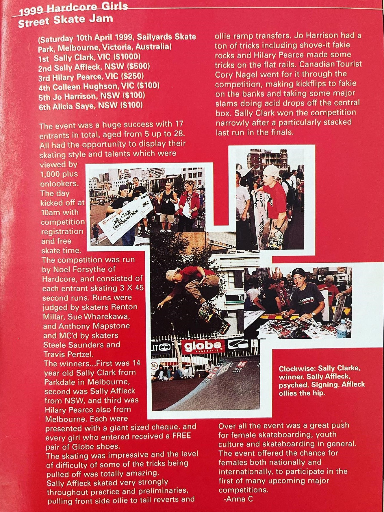 On April 10th, 1999, the Girls Street Skate Jam (sponsored by Split Clothing / Hardcore Distribution/Globe) was hosted on Flockhart Street at the Sailyards Skate Park in Melbourne and the local media was stoked, even TransWorld noted the event in their June 1999 Industry news report. The contest followed in the footsteps of the All Girl Skate Jam, which launched in 1997 in San Diego by Patty Segovia.