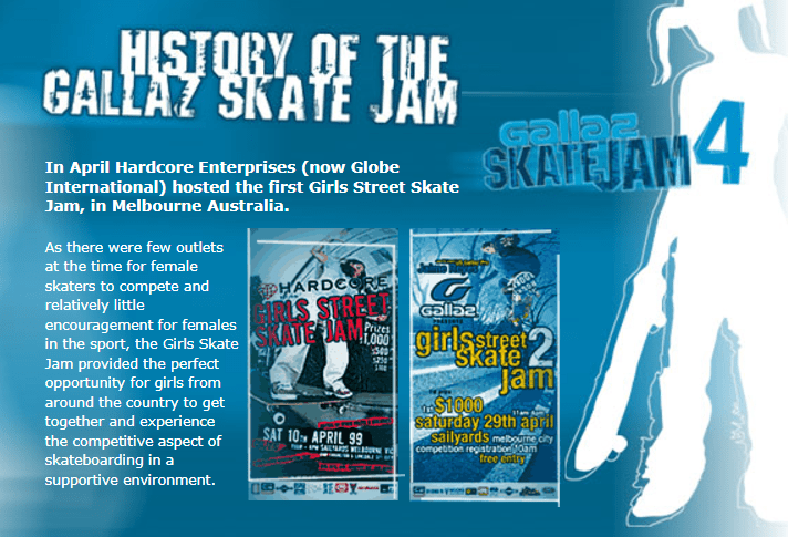 Check out the book Unemployable: 30 Years of Hardcore, Skate and Street (2016) by Jason Boulter, which includes a chapter on Gallaz and is a an incredibly thorough account of the Australian company Globe International and the Melbourne-based brothers, Stephen, Peter and Matt Hill. Speaking of Stephen, in the AKA: Girl Skater video he stated that the Globe / Gallaz Skate Jam was the biggest contest in the world for girls and that female skaters should have been “treated equally as it should have always been.”