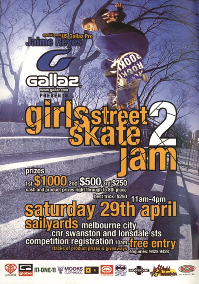 To launch the new brand, another contest was held the following year with Gallaz as the official sponsor. This event was won by local Monica Shaw, and Kiwi skater, Georgina Matthews (who had won the NZ Nationals) came 2nd who was excited to meet her hero, Jaime Reyes who was a judge and performed a demo. The event was on April 29, 2000, at the Sailyards in Melbourne and was called the Australian Girls’ Street Skate Jam 2. *Does anyone have the full results?*