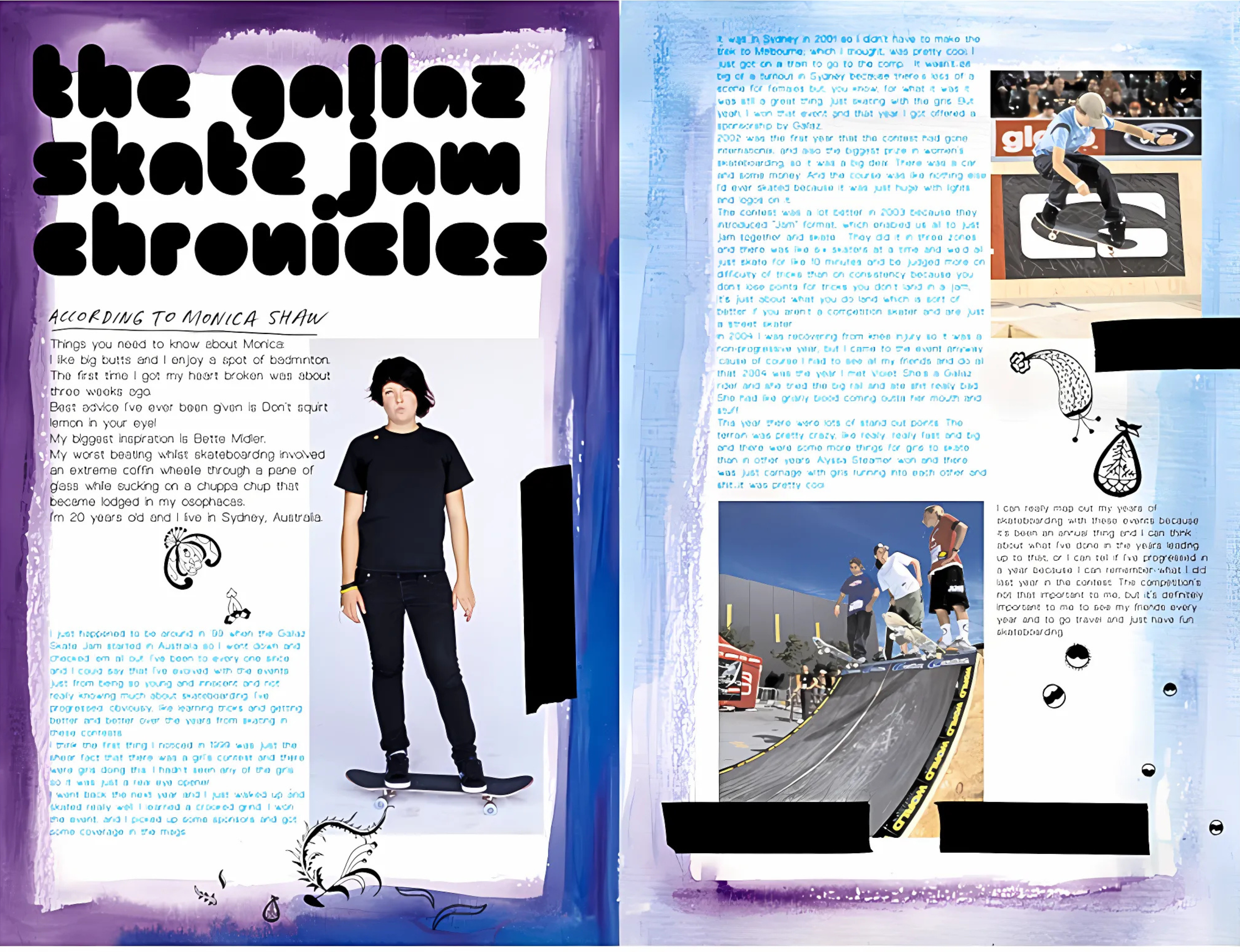 In the Gallaz Magazine (2005), Australian skater, Monica Shaw reflected on her sponsorship and the contest series in an article called “The Gallaz Skate Jam Chronicles.” She said, “‘I just happened to be around in ’99 when the Gallaz Skate Jam started in Australia so I went down and checked ‘em all out. I’ve been to every one since and I could say that I’ve evolved with the events just from being so young and innocent and not really knowing much about skateboarding. I’ve progressed obviously, like learning tricks and getting better and better over the years from skating in these contests… I think the first thing I noticed in 1999 was just the shear fact that there was a girl’s contest and there were girls doing this. I hadn’t seen any of the girls so it was just a real eye opener.”
