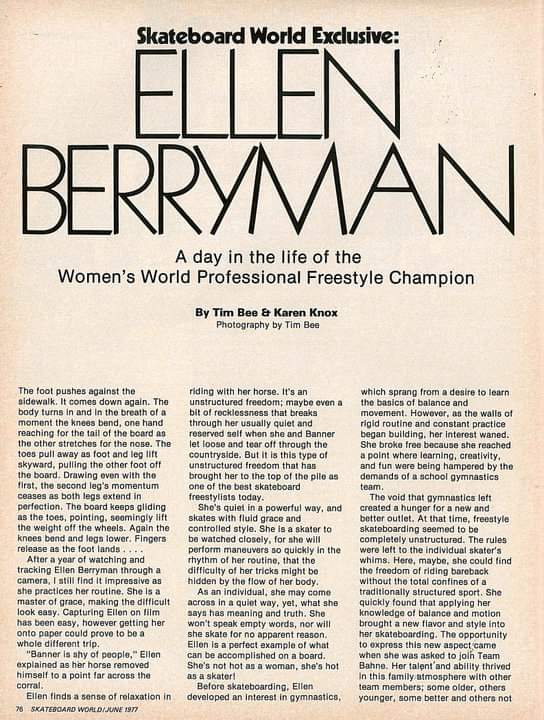 - Bee, Tim and Karen Knox. “Ellen Berryman.” Skateboard World (June 1977): 76-79.