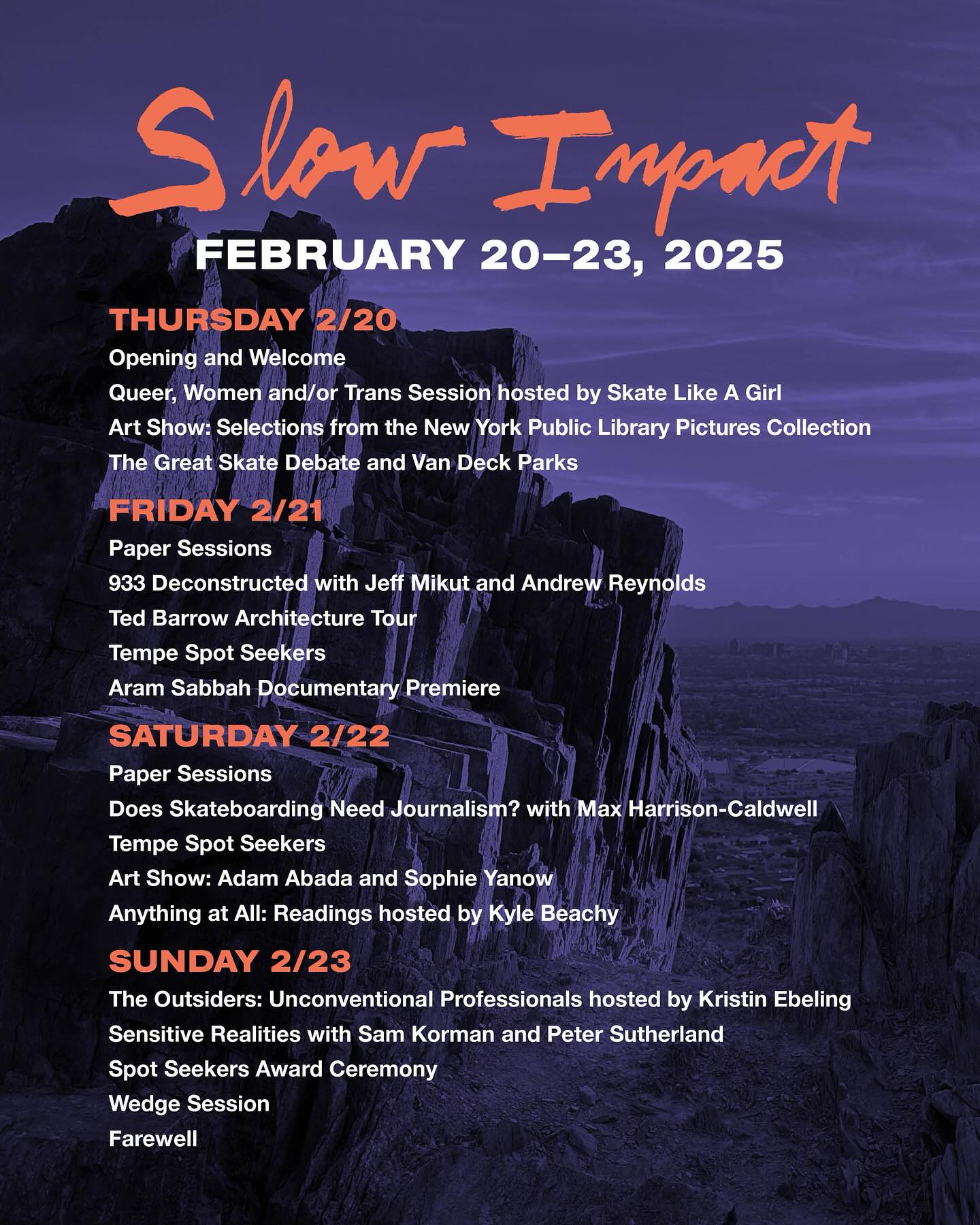 In anticipation of Slow Impact 2025 in Tempe, Arizona I’ve been preparing some excerpts from my book to read as a kind of “sneak peak.” If you’re at the event, skater / author Kyle Beachy has arranged an evening called “Anything At All” at 8pm on February 22nd at Cowtown skateshop. It should be a great line-up of presenters. Plus, my friend, graphic novelist Sophie Yanow has her work on exhibit there with an opening the same night along with Adam Abada.