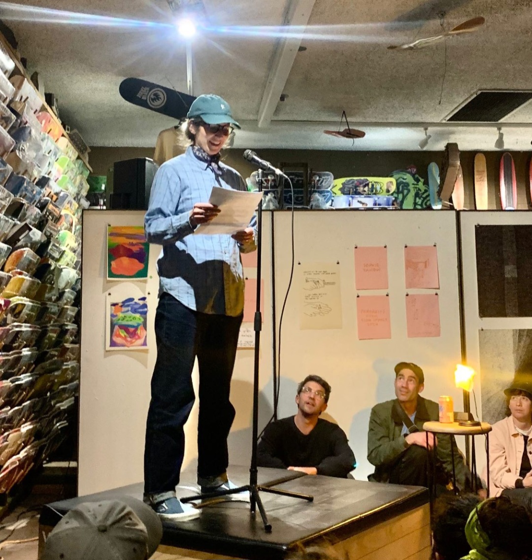 My final contribution to Slow Impact was thanks to skater / writer Kyle Beachy who invited me to join his “Anything At All” feature, where ten readers share something within a five-minute quota. This year, the Cowtown skateshop was converted into a gallery and salon, featuring Sophie’s drawings and the artwork of Adam Ababa! Kyle set the scene with a reading from his book (currently being pitched to publishers) that I adored… a letter to a sister by a seemingly troubled older skater brother. It was mesmerizing.