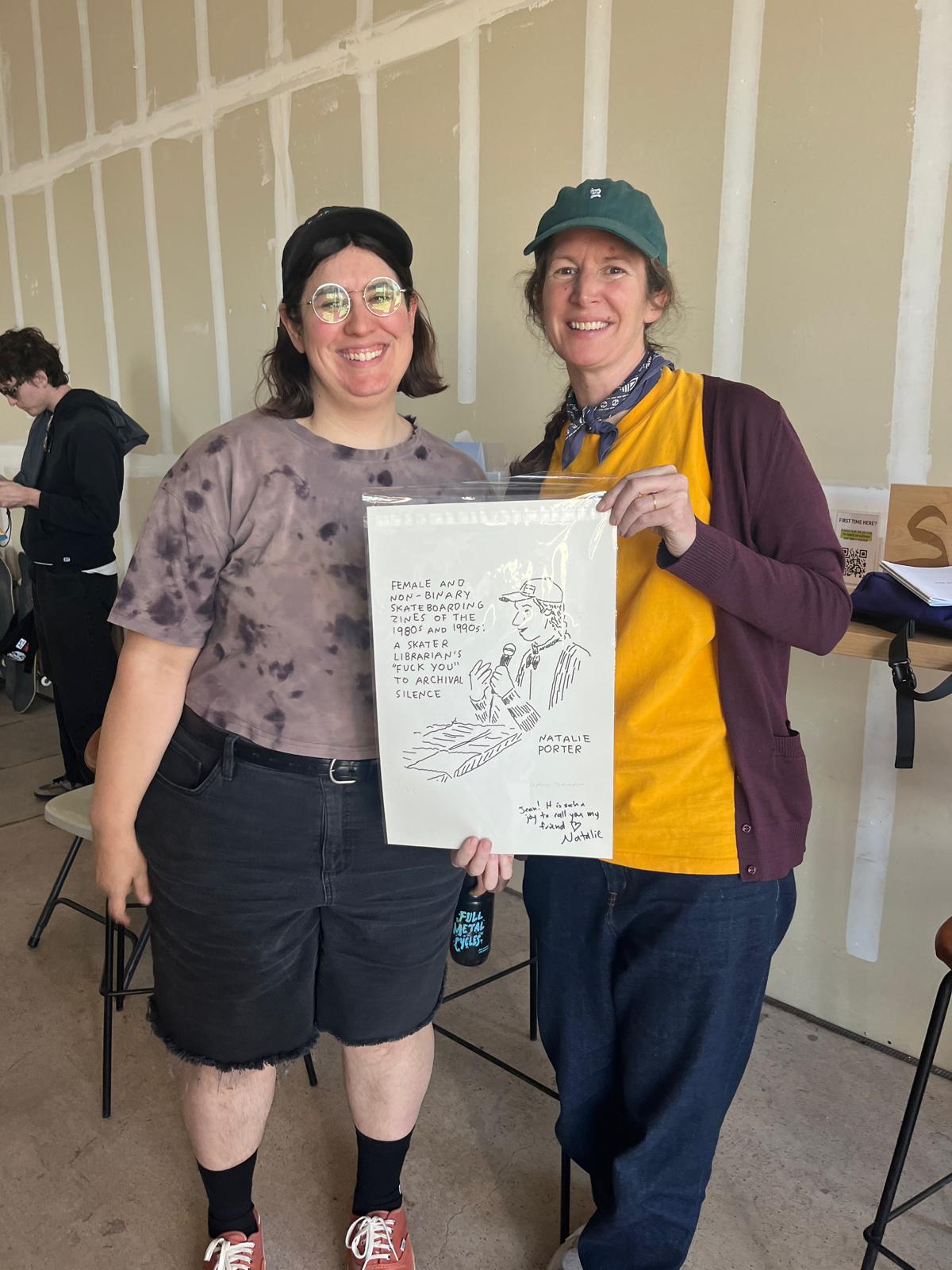 Photos: Sophie sketched a portrait of me from Slow Impact 2024, and Jean made me autograph a copy! I decided to rock my vintage Rookie NYC t-shirt for the occasion. Plus, I got to connect and hang with Anita Tessensohn of Powell Peralta fame, who was at the SkaterCon event nearby and decided to check out Slow Impact. Amazing.