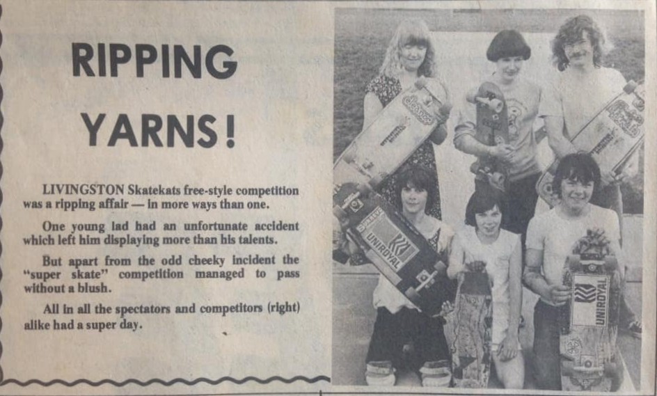 In the 1970s, the skateboarding boom that originated in California, was having a global effect, “which prompted Kenny Omond to approach the Livingston Development Corporation with the idea for a skatepark” (Scott). Kenny was an avid skater and eventually designed an extension to the park in 1992. He is a wealth of Scottish skateboard history and oversees the Facebook page, “Livi Skates and the Participatory Anthropic Principle.” Iain was on board even if some of his architect buddies were less than enthusiastic. In fact, Kenny posted a news-clipping on Facebook that Iain had received from his peers announcing the demise of skateboarding! Check out the page for loads of vintage photos and skatepark blueprints.
