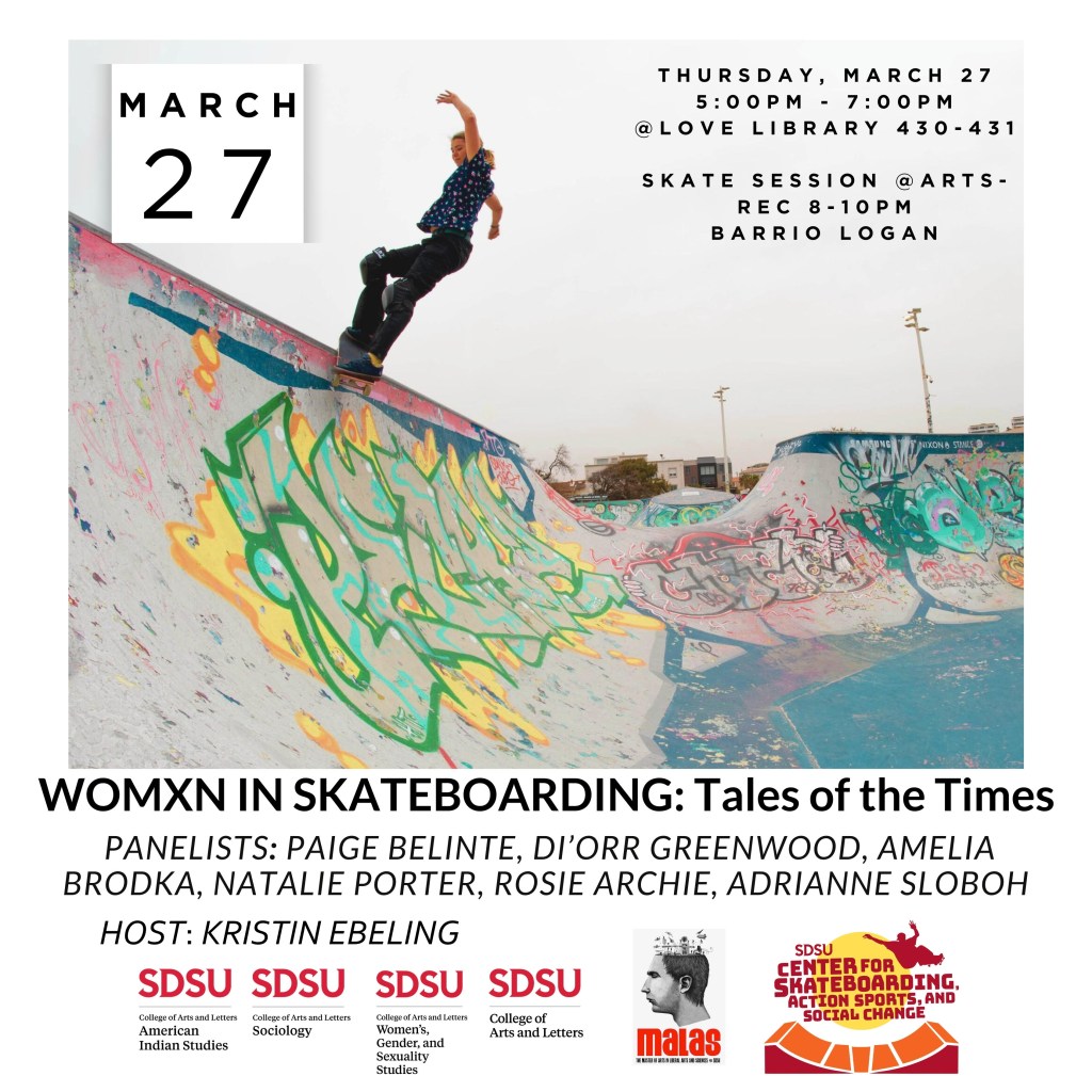 It was a joy to be able to speak to some of these concerns via Zoom for a women’s history month panel with the SDSU Center for Skateboarding, Action, Sports, and Social Change last week alongside Rose Archie, Adrianne Sloboh, Amelia Brodka, Di’Orr Greenwood and Paige Belinte, hosted and moderated by Kristin Ebeling. What a dream team!