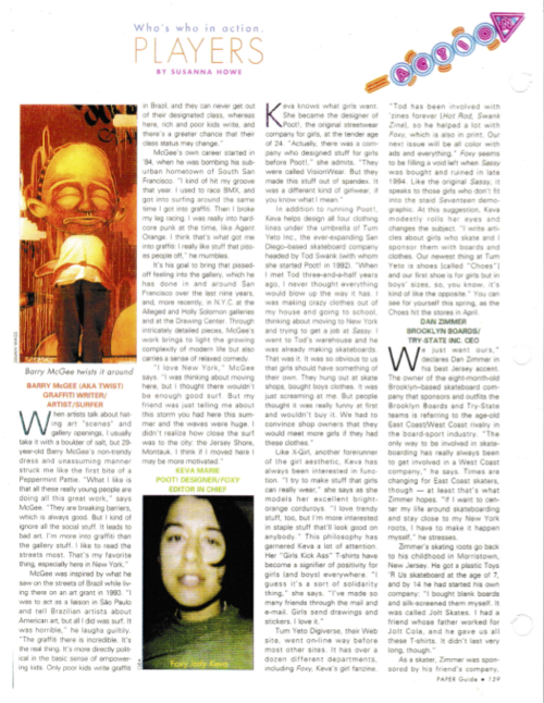 - Howe, Susanna. “Players: Who’s who in action.” PAPER Guide (1995 ?).