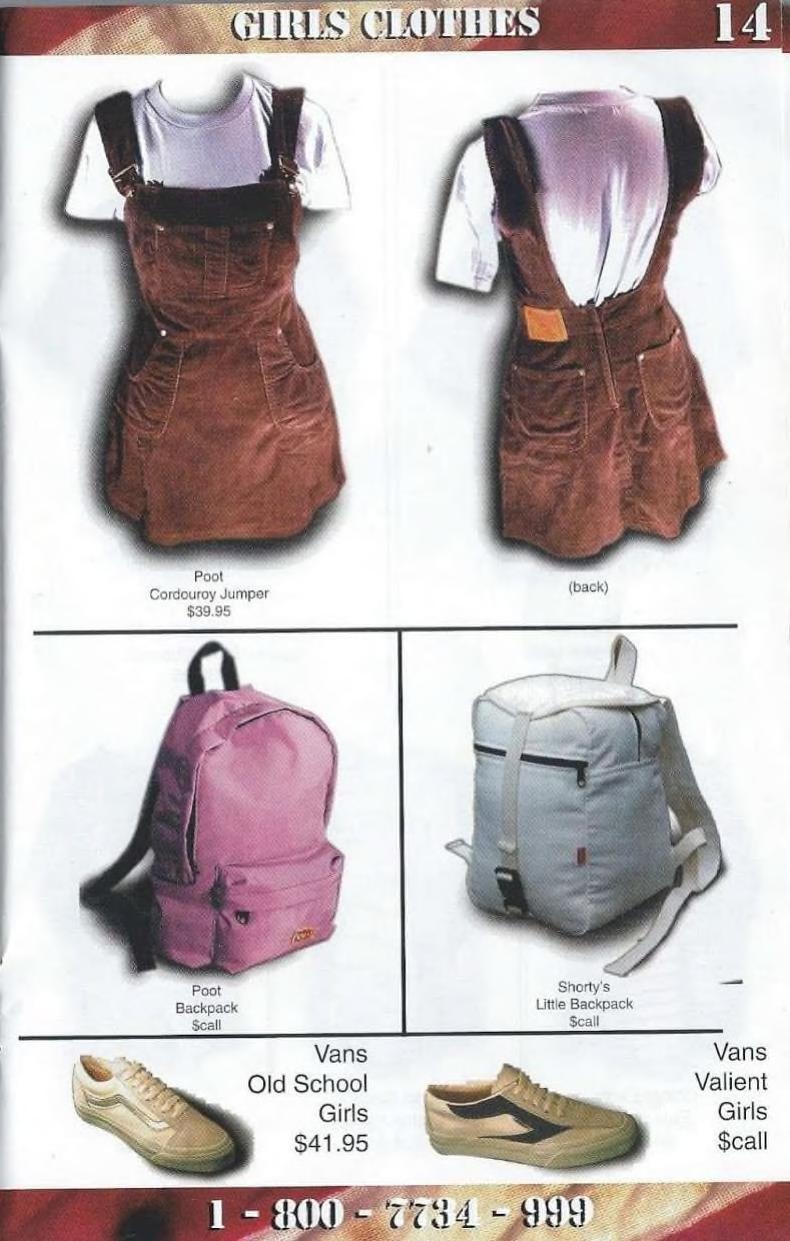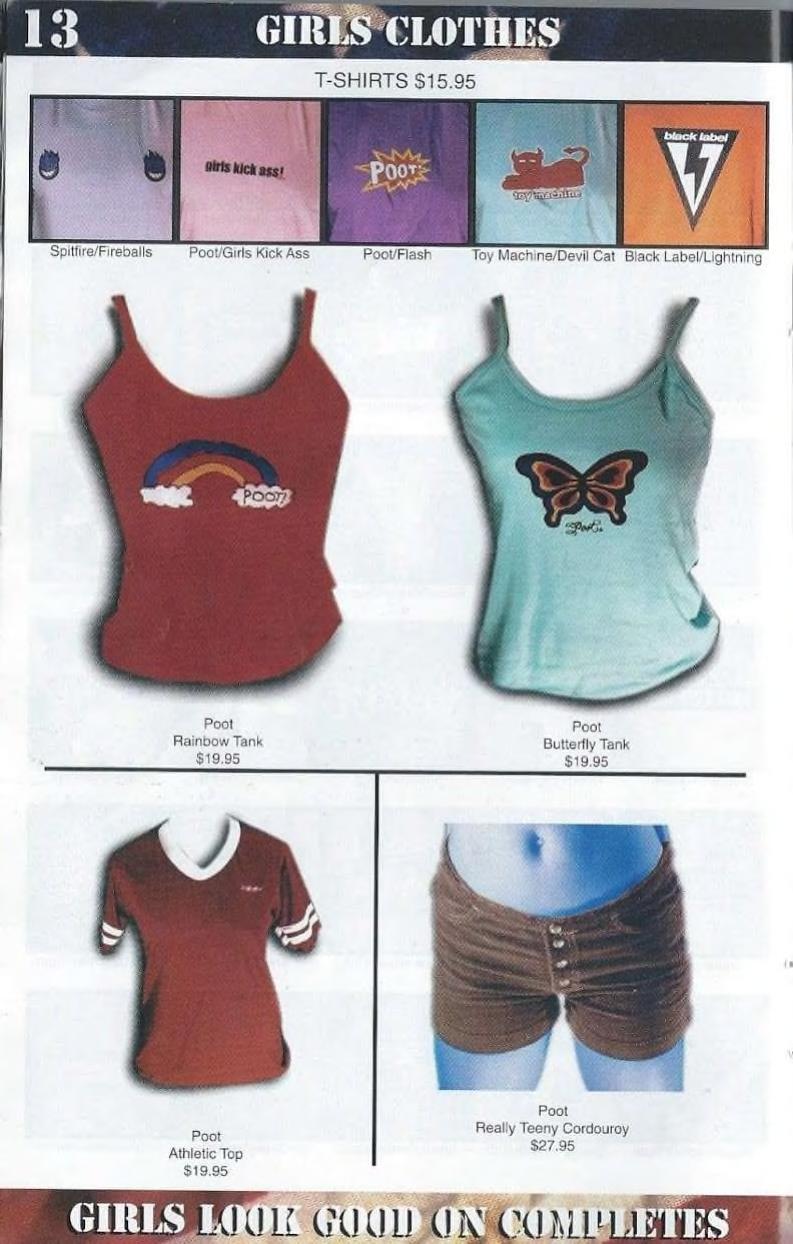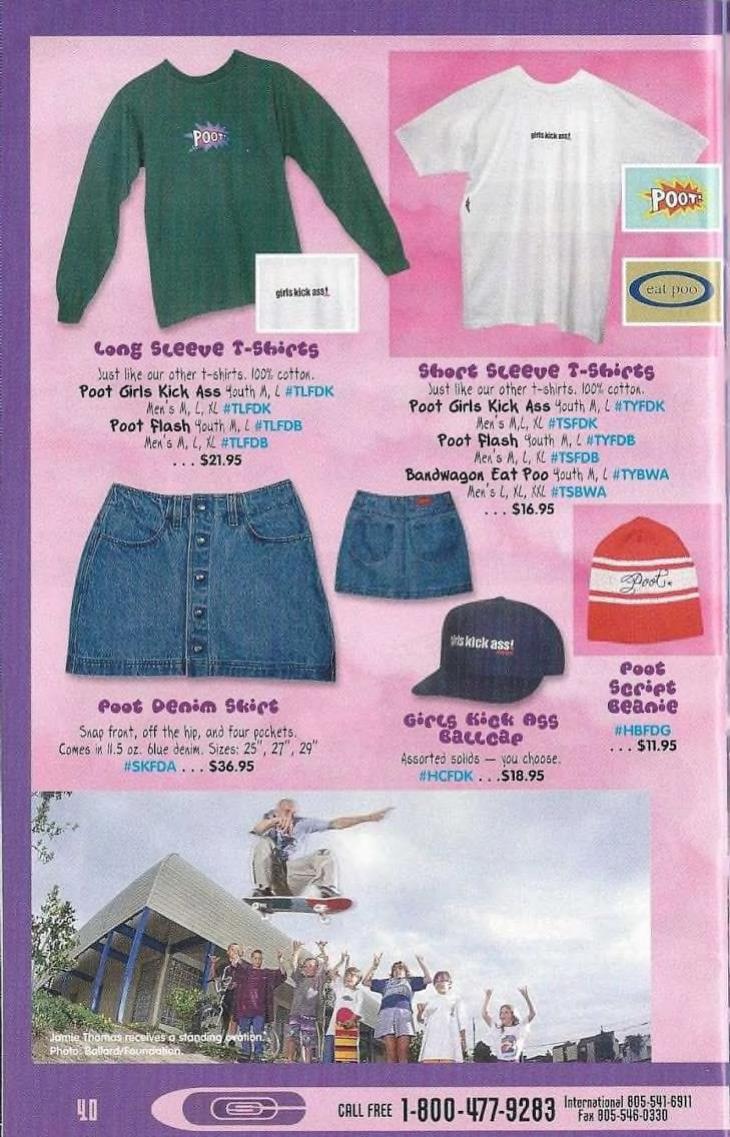 “I am sublimely fond of your magazine except for its sexist content towards women. Women are presented more as tools, objects, ultramasculine, virile collateral. I am a female skater, and I find some of your ads as well as reading content to be demeritorious. I am especially disgusted with your “Poot” ads. They (the items of clothing) are nothing more than too-tight, overpriced, trendy pieces of shit. I always see girls hang out at the Sea-Skate (in Seattle), wearing those Poot-inspired clothing articles. They don’t even skate.”