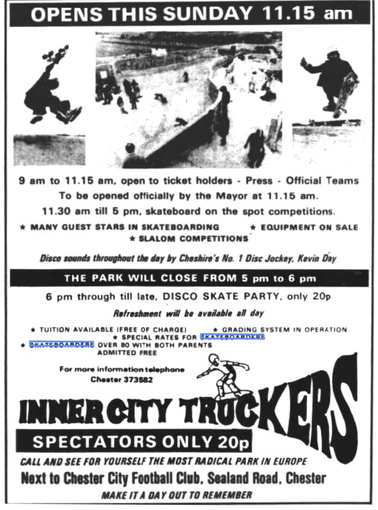 In 1978, a maze-like concrete skatepark was opened in Chester, UK by Geoffrey Blythin called the “Inner City Truckers Skateboard Park” on Sealand Road, on the former site of the city’s Royalty Theatre. According to a news article by Ian Callister called “What would Marie Lloyd have made of kick-flips?”, there was one young girl holding her own in the mob scene of a hundred boys – Rebecca Griffiths!