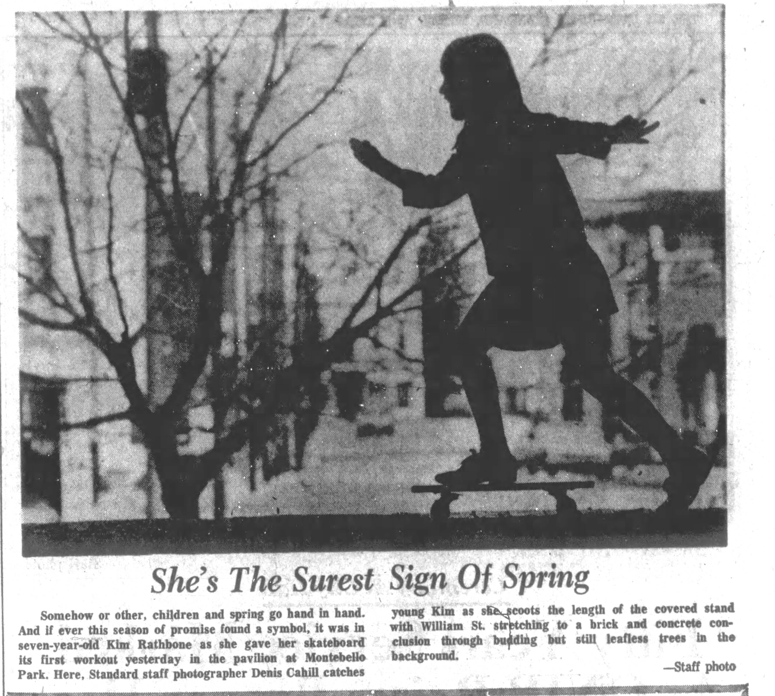 - Kim Rathbone age 7 of St. Catharines, Ontario in Canada, hit the streets on her skateboard, documented by The Standard newspaper on April 1, 1968.