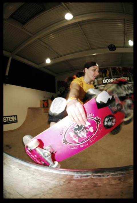 In an article from 2005, Franzi shared some of her travel highlights including competing against the Brazilian prodigy, Karen Jones at the Mystic Sk8 Cup in Prague as the lone two female vert skaters. She was joined by Tina Neff at the “Splash Festival” in Chemnitz, Germany, and they had to battle their way through a snake session / jam contest with 13 guys! Franzi was stoked to have beaten three guys and acknowledged that Tina was her favourite person to skate with.