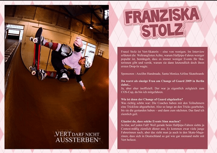 Franzi rode for a variety of sponsors over the years including Santa Monica Airlines, Nikita Clothing, Cool Girl Skateboards, Speed Rats Wheels, Barrio Berlin Skateshop, Suck My Trucks team, Murky’s Skateboards, and Anziihn Handmade. On an old personal website, there was mention of some press, including interviews and photos, such as a Titus female checkout, “Friends of Vertskate” zine, Limited magazine, The Box Mag, 24 Heures, and Berliner Tages Zeitung, as well as TV appearances such as an interview for Tele Basel.