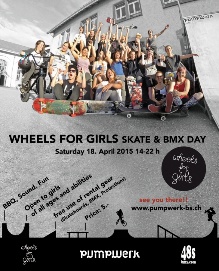 Above: poster for the “Wheels for Girls” day in 2015 at Pumpwerk skatepark with Franzi seated bottom right