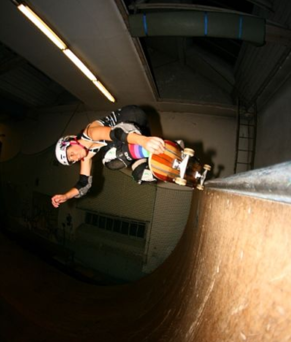 The pro female vert skater lifestyle wasn’t exactly luxurious. In 2011, she said, “I’m living in a very small rented apartment, I don’t have a car or a driver’s license, and I’ve had to pay for everything myself: traveling, accommodations, the starting fee at all contests.” Fortunately, this was around the time that Skip Engblom and his Santa Monica Airlines skateboards stepped up and offered to help cover some costs.