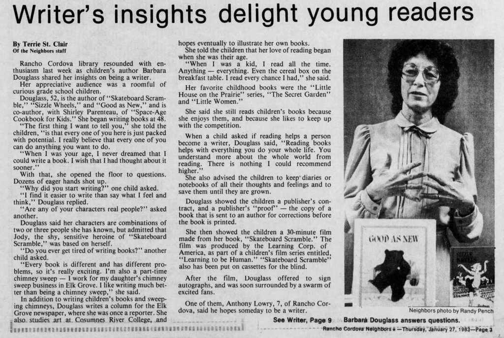 Author Barbara Douglass was also featured in the news, in an article for the Sacramento Bee from January 27, 1983, called “Writer’s insights delight young readers,” but with a more positive spin. I first heard about Barbara thanks to Colin Bane, an adventure journalist for ESPN and X Games who gave me the heads up that a CBS skateboarding special on TV called “A Different Kind of Winning” (1980) was based on her book called Skateboard Scramble (1979).