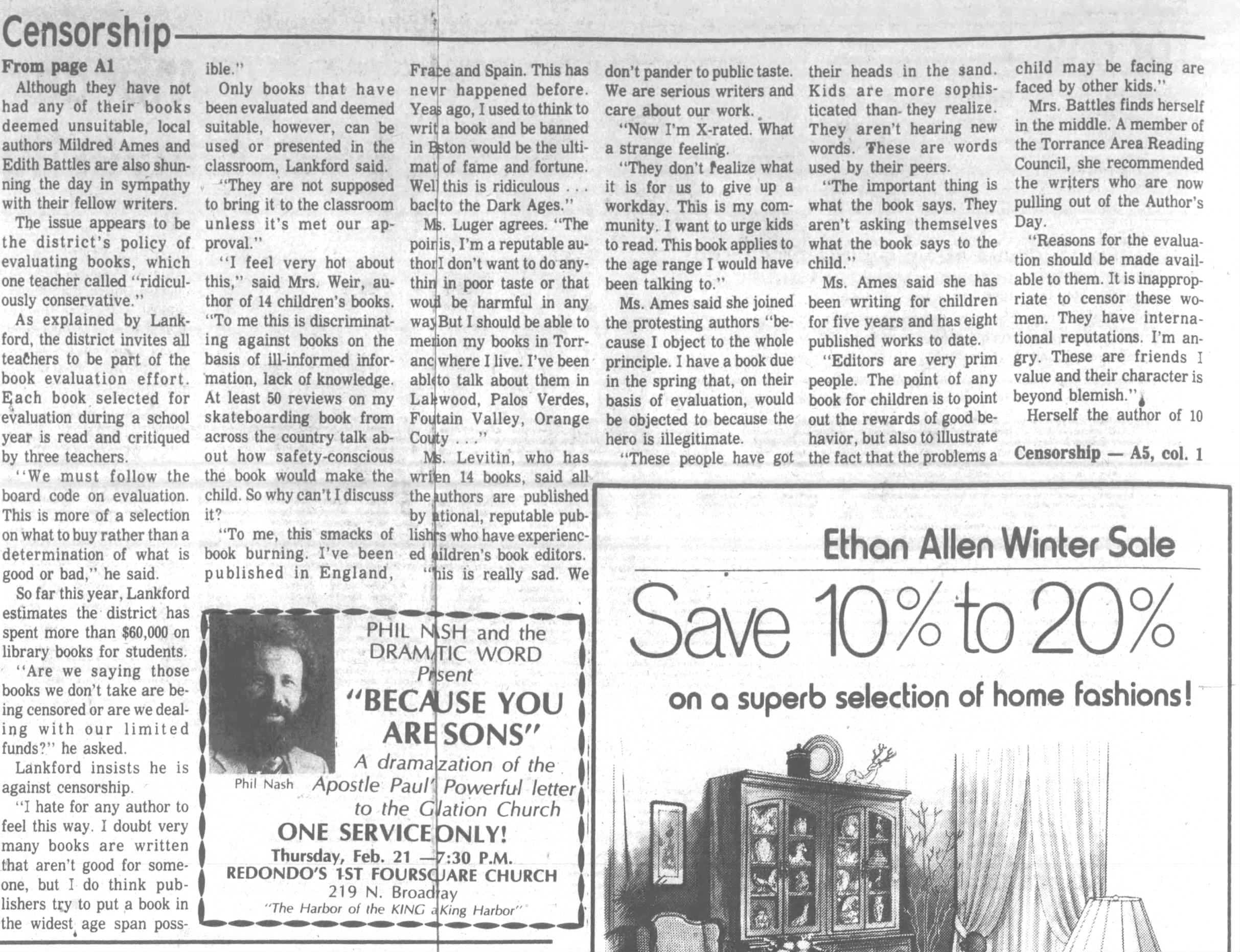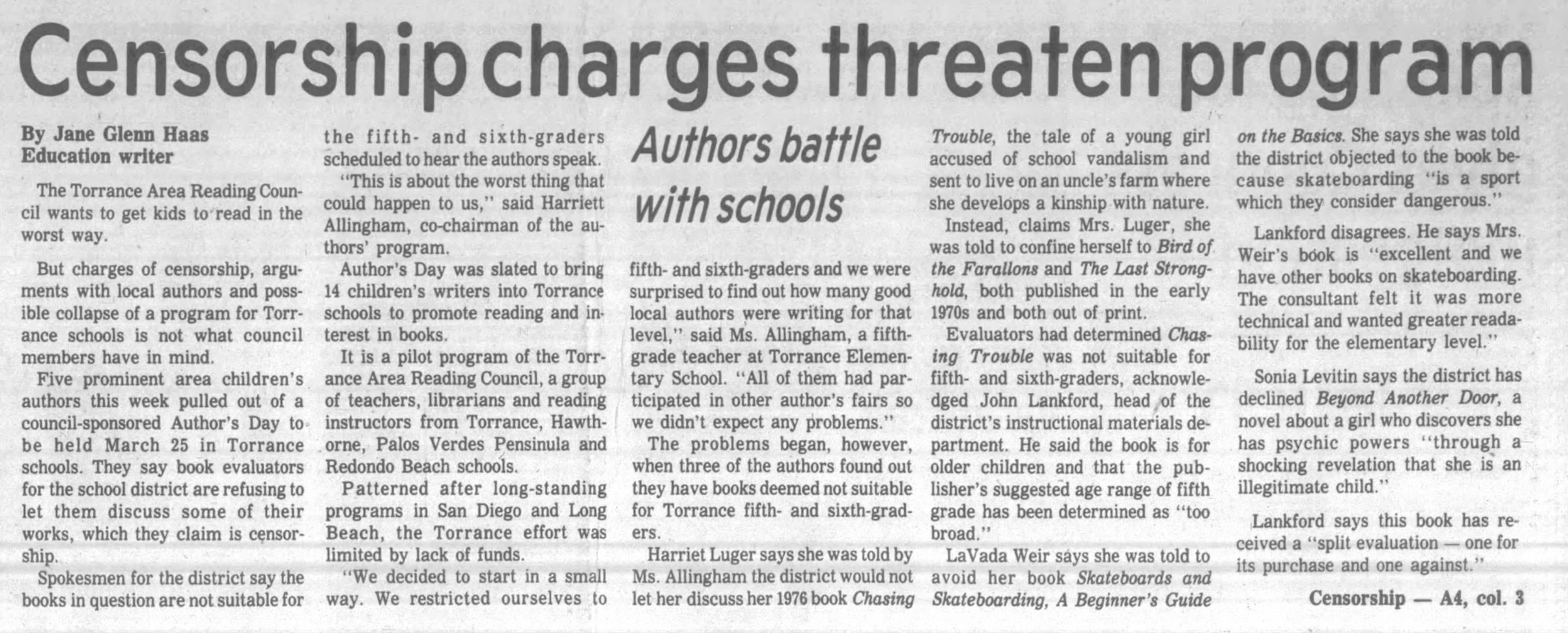 - Haas, Jane Glenn. “Censorship charges threaten program: authors battle with schools.” Daily Breeze – Torrance (February 21, 1980) A1, A4-A5.