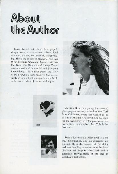 Finally, I want to mention Laura Torbet (nee Robbins), who was a 34-year-old graphic designer and amateur athlete who took up skateboarding while writing the book The Complete Book of Skateboarding in 1976, which was then translated into German the following year. Torbet’s range of books was quite vast and random, covering topics like macrame, leathercraft, a dictionary of foreign terms, playing squash, making t-shirts, using color markers, etc.
