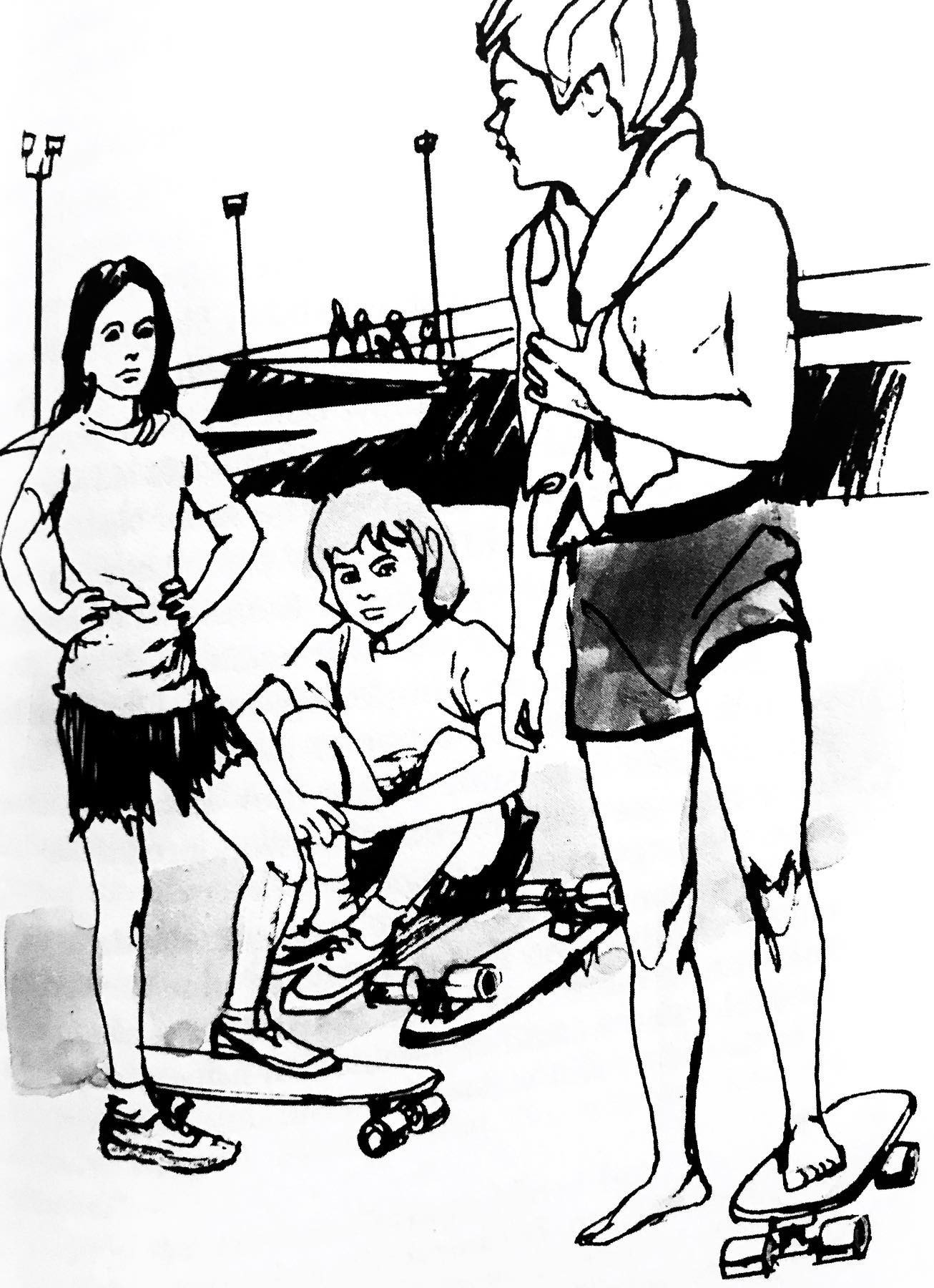 Even though Skateboard Scramble is rooted in the Seventies, the plot still resonates today, especially as we see an increase in parents imposing competitive aspirations on their skateboarding children, undoubtedly destined for sponsorship and the Olympics, or so they like to hope. On occasion, the book has popped up on Ebay and Etsy, and it’s worth considering. The animated ink designs by illustrator, Alex Stein, are tattoo-worthy according to Colin Bane!