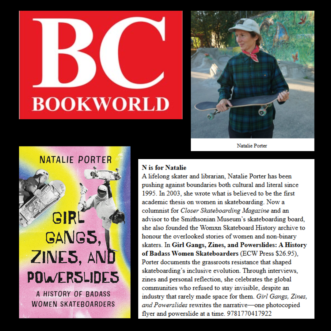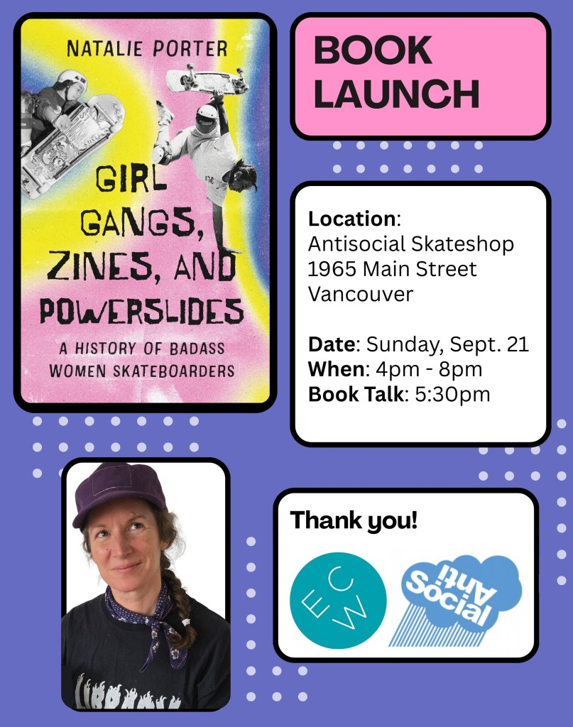 Cole has been an awesome supporter of the project (he even wrote a blurb for the book), and will be the host of an event at the Vancouver Public Library on Tuesday, September 23rd at 6:30 – 8:00pm alongside author, Amy Mattes. Amy and I have a long history together, as we were both part of the Skirtboarders girl gang in Montréal in the early 2000s, contributing to the zine Armpit. Pulpfiction Books will also be selling copies of our books!