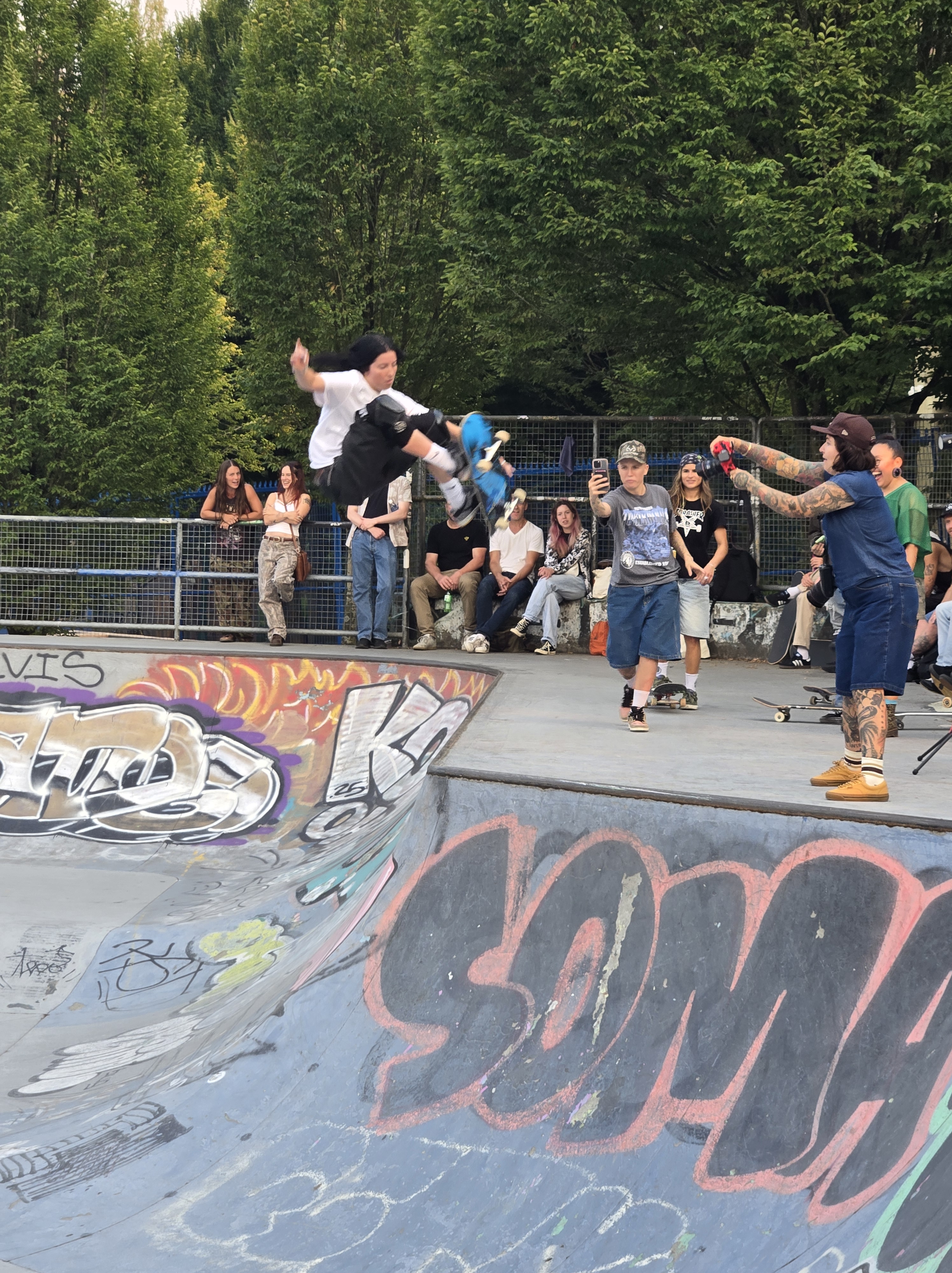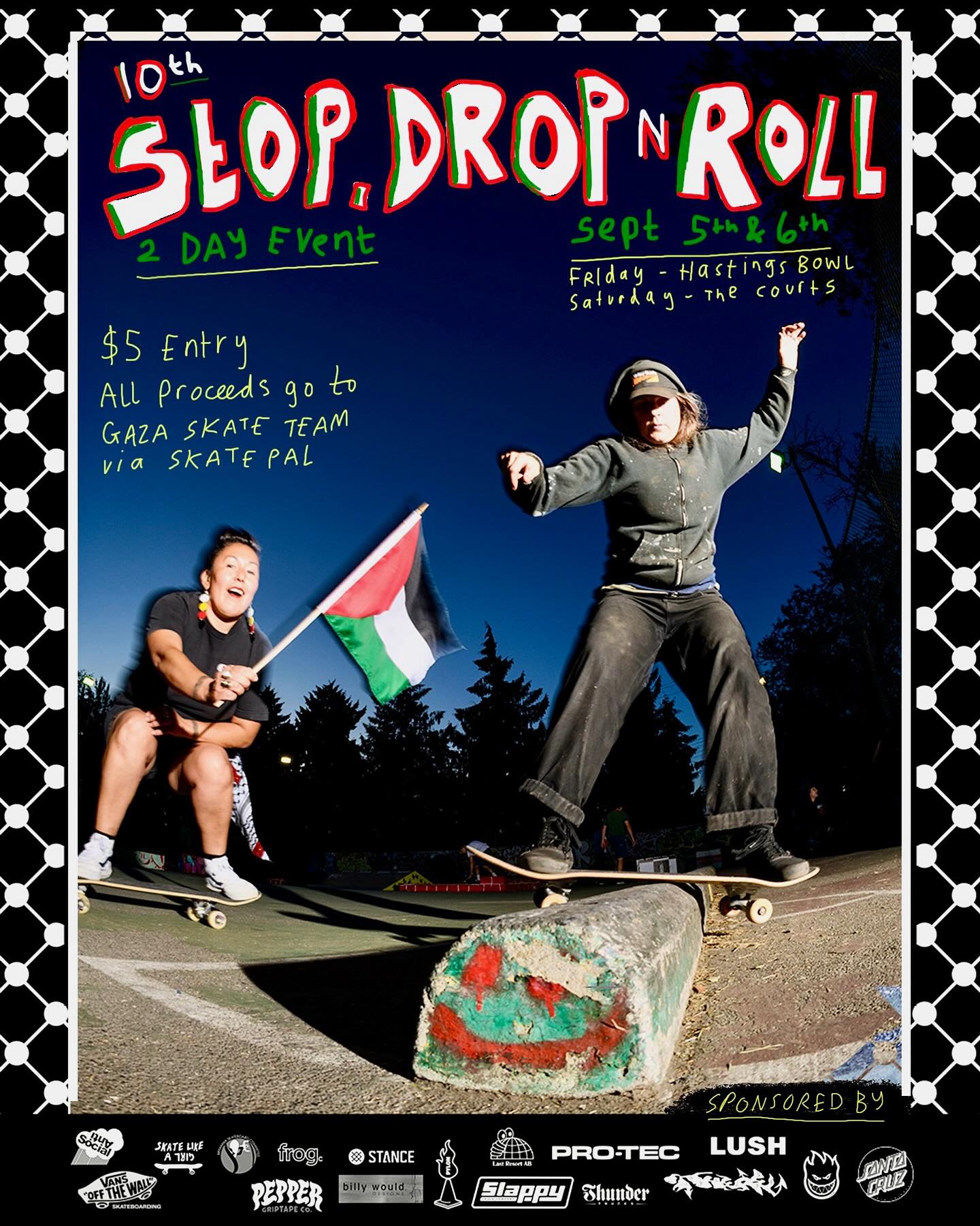 Last weekend, I attended the 10th Anniversary of Stop, Drop, and Roll inclusive skateboard contest, hosted by the fabulous Rose Archie of Nations Skate Youth, fundraising for the Gaza skate team via SkatePal. I’ll admit to being a bit overwhelmed by so many people since I mostly skate alone in Powell River with the exception of the occasional dude or scooter kid, but it was pretty amazing to witness the skill level of some legendary pro skaters and newcomers like Canadian Evie Pritchard.