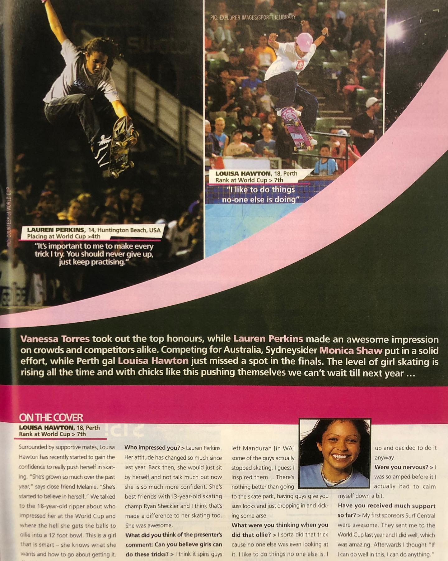 Louisa (age 18) took the cover for the April 2003 issue of Chick and received a short interview. Louisa said she was impressed by Lauren Perkins (who came 4th) who skated with confidence, and it was evident that Louisa had confident to spare! She said some guys in her town “actually stopped skating. I guess I inspired them… There’s nothing better than going to the skate park, having guys give you suss looks and just dropping in and kicking some arse.” Oh hell yes!!!