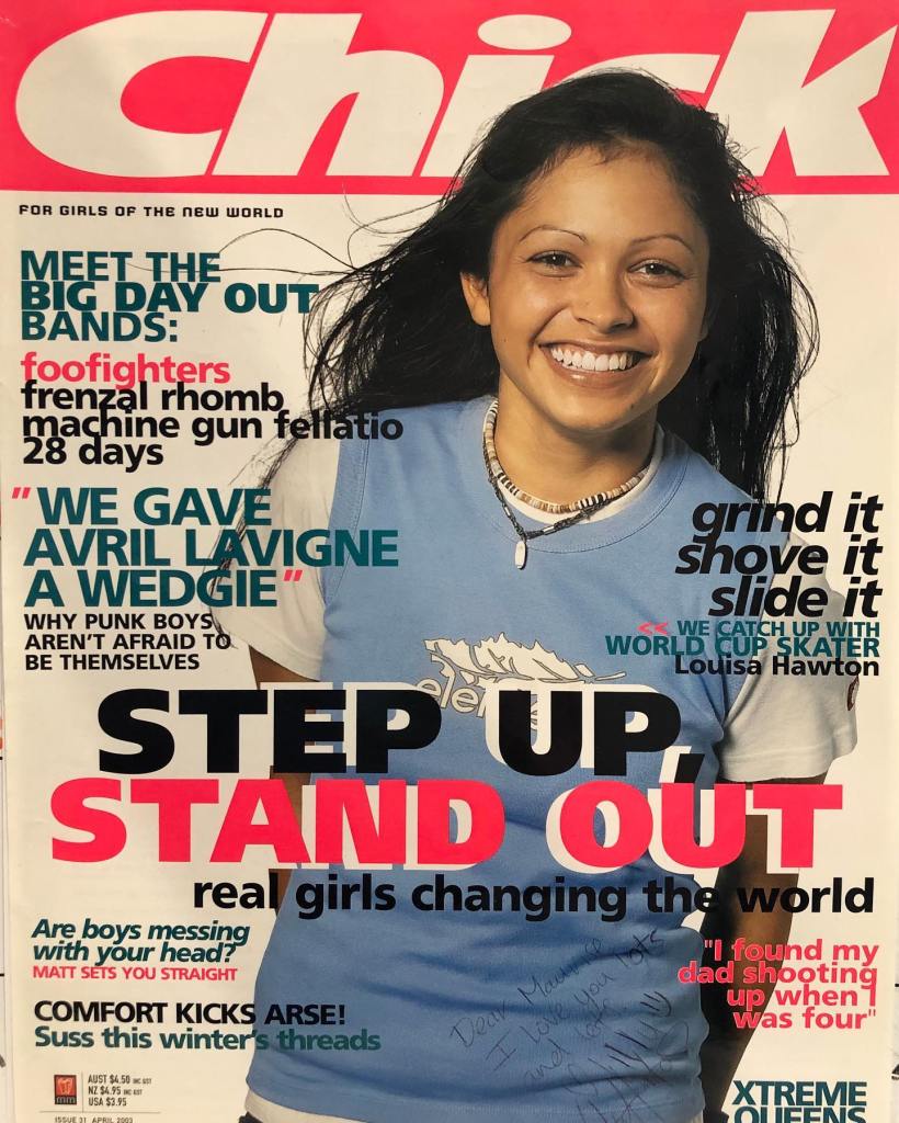 Louisa was fortunate to be skateboarding in Australia when Globe shoes launched the Globe World Cup, which included a division for women, called the Gallaz Skate Jam after their brand, Gallaz shoes. Louisa competed at the Gallaz Skate Jam 4 (Globe World Cup) in February 2002 in Melbourne placing 9th in street (won by Amy Caron), and then, the following year, improved on her result, placing 7th out of 30 girls (won by Vanessa Torres). During her run, Louisa ollied into a 12-foot bowl, which meant she was noticed by the editors of Chick. The publication was described as a “mini-mag for girls who surf” in Australia with 72 issues from 1998 – 2006.