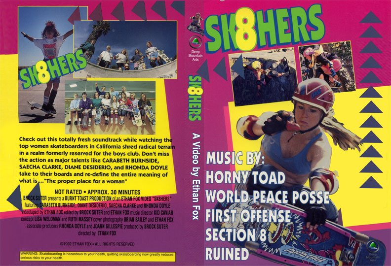 By 1992, Equal Time zine had a distribution of 1000 and 250 members, and that year the first women’s only skateboard video called SK8HERS (1992, Ethan Fox) was released celebrating 14 skaters. Patty had a part in the video and bantered with Cara-beth throughout. Unfortunately, no mainstream skateboard magazines celebrated their accomplishment. The video went practically ignored by the industry [see YouTube for full recording].