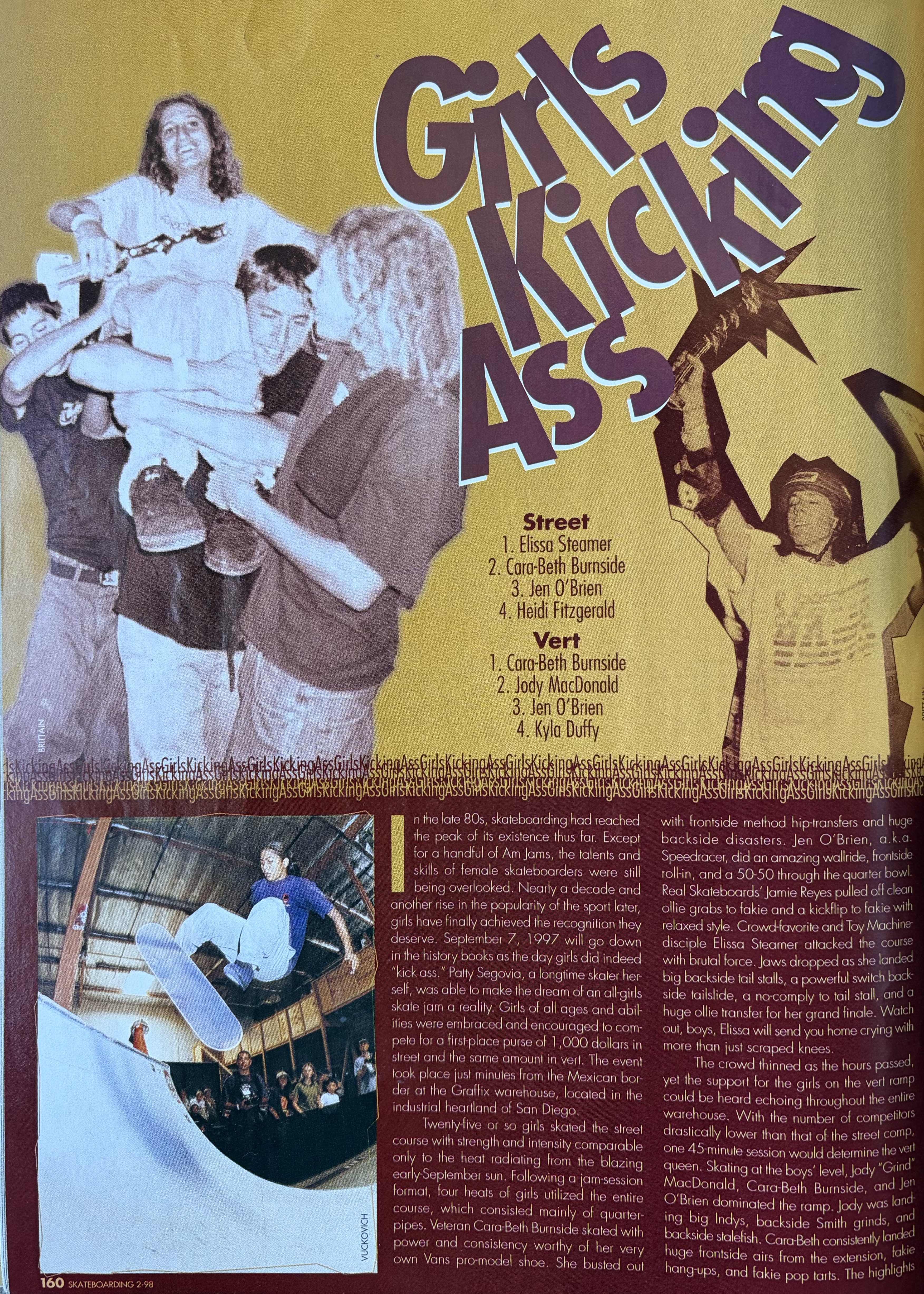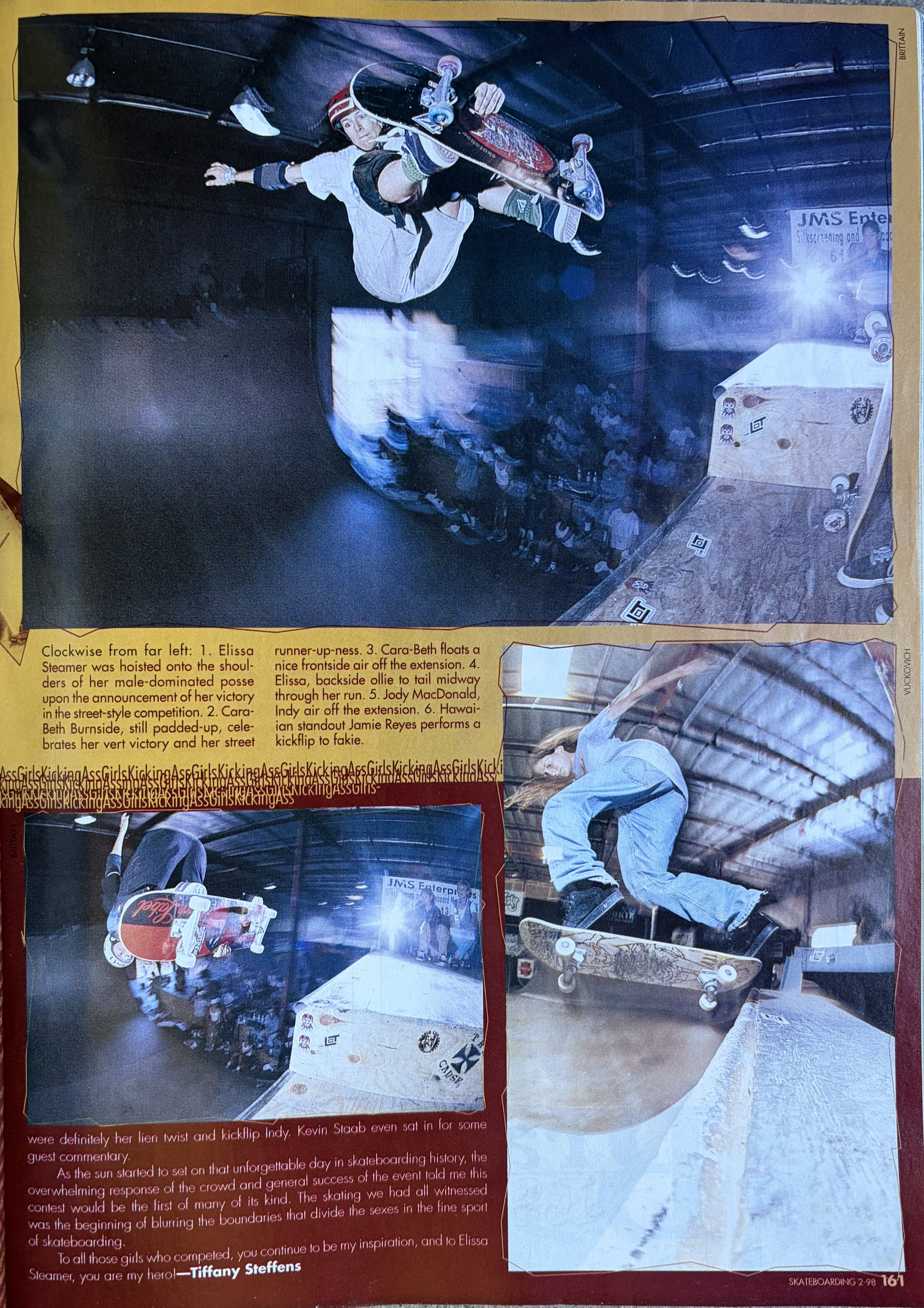 “Girls Kicking Ass” article from the February 1998 issue of TransWorld Skateboarding by Tiffany Steffens