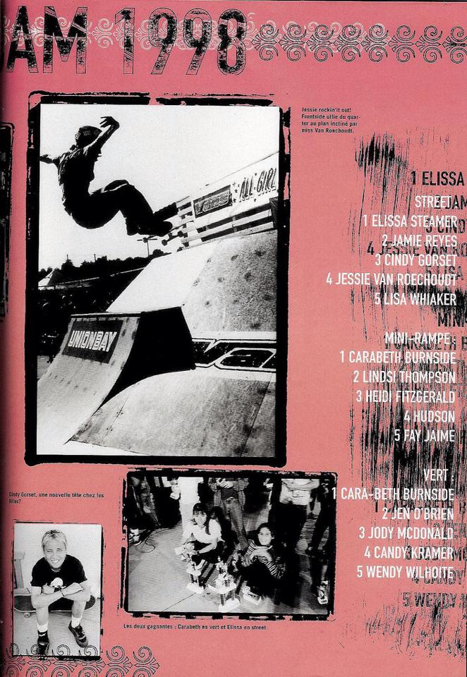 Another skateboard magazine called SUGAR from France included coverage of the event with a nice photo of the winners Cara-beth and Elissa posing with their trophies at the 1998 AGSJ, a portrait of Cindy Gorset, and an action shot of Jessie Van Roechoudt.