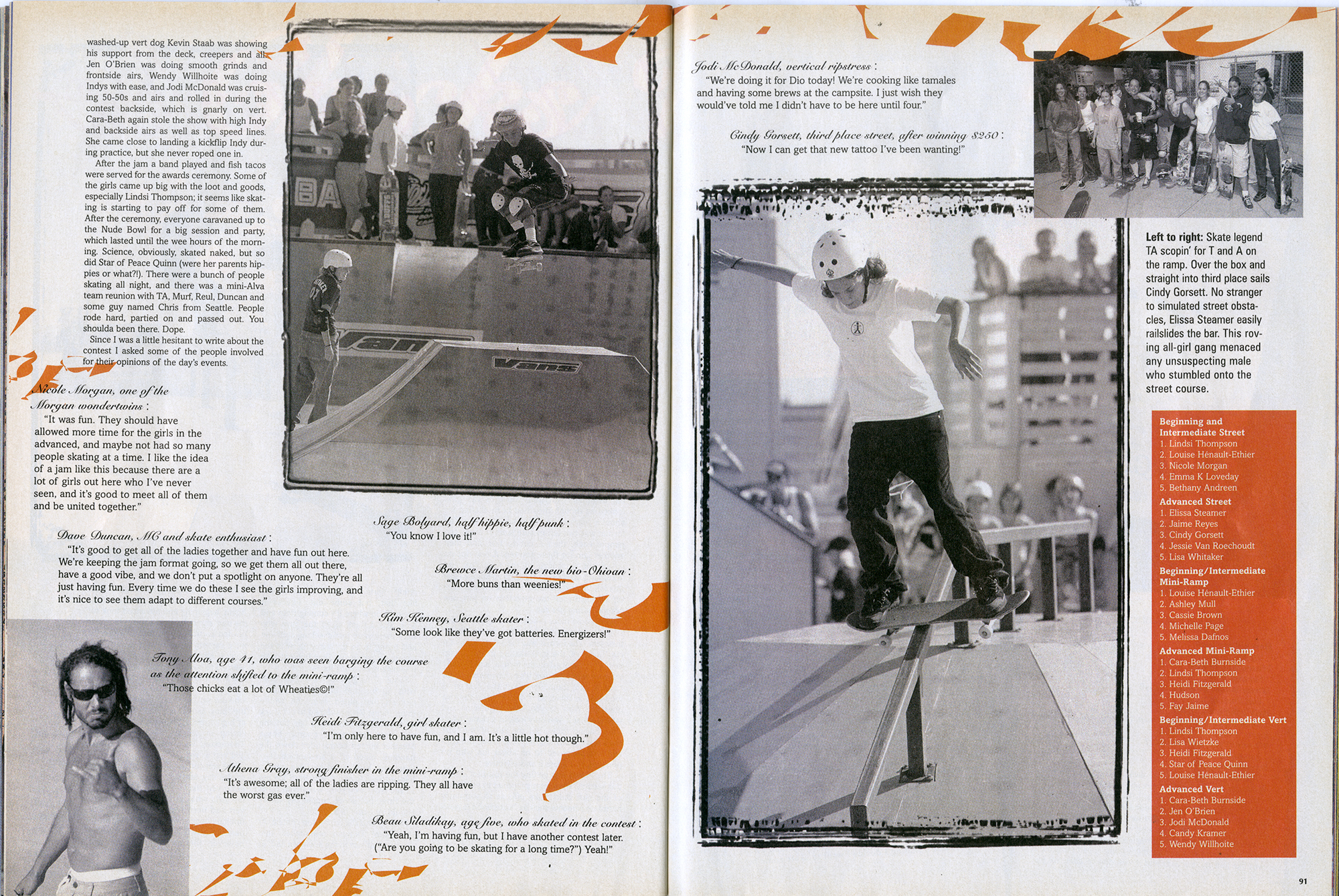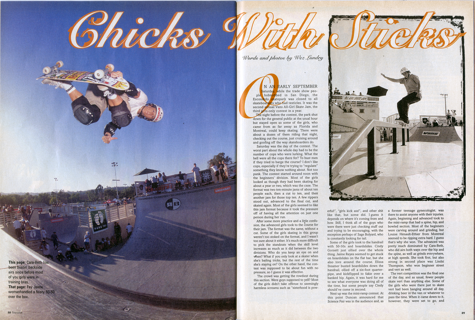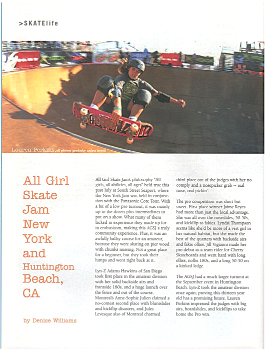Wez Lundry for Thrasher magazine offered his perspective of the 1998 AGSJ in the January 1999 issue with an article called “Chicks with Sticks.” A few action photos were included of Cara-beth Burnside, Faye Jaime, Elissa Steamer, and Cindy Gorset. The report had a few cheesy elements and a few suspect quotes but overall offered some thorough coverage. The results were also included which provided a sense of the depth of competition.