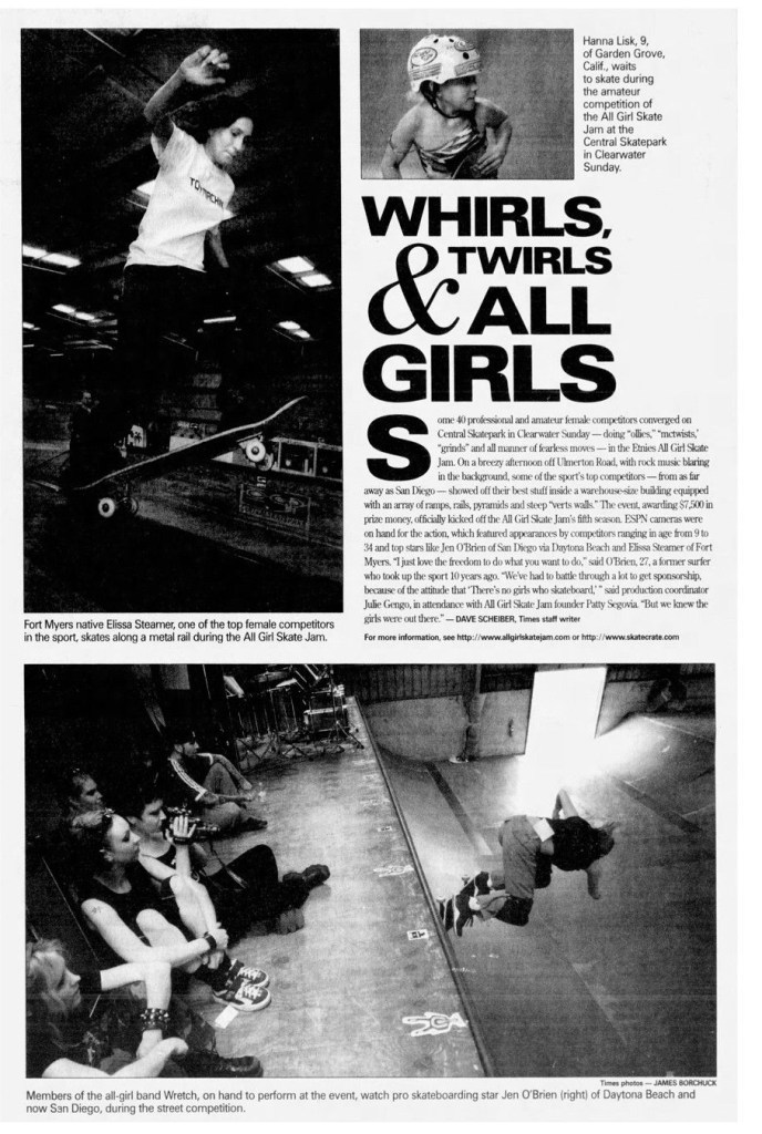 In 2001, the Tampa Bay Times reported on the AGSJ because it was hosted in Clearwater, Florida with an article called “Whirls, twirls, & Girls” by Dave Scheiber. It was noted that Etnies shoes stepped up to sponsor the event with $7500 in prize money.
