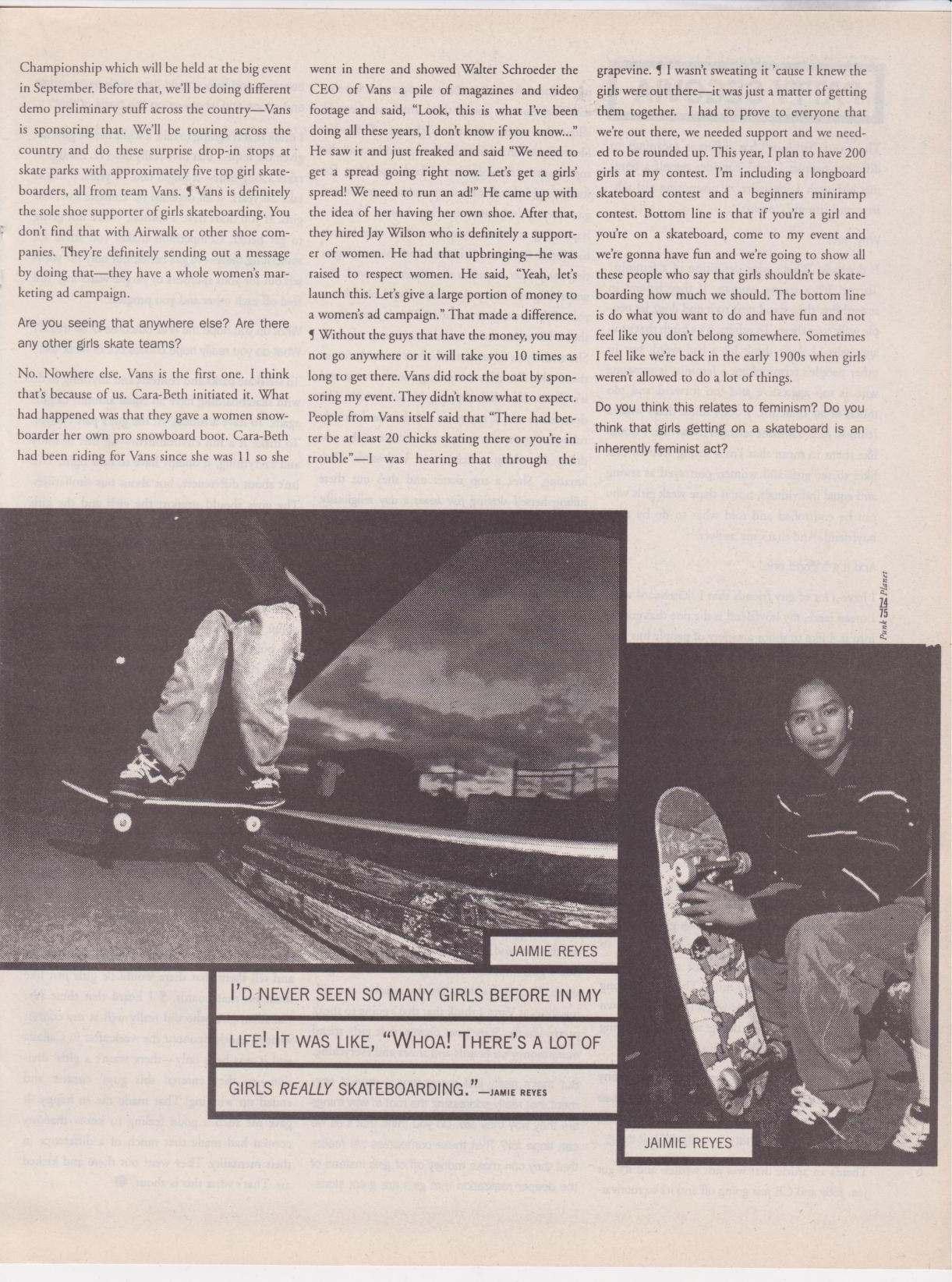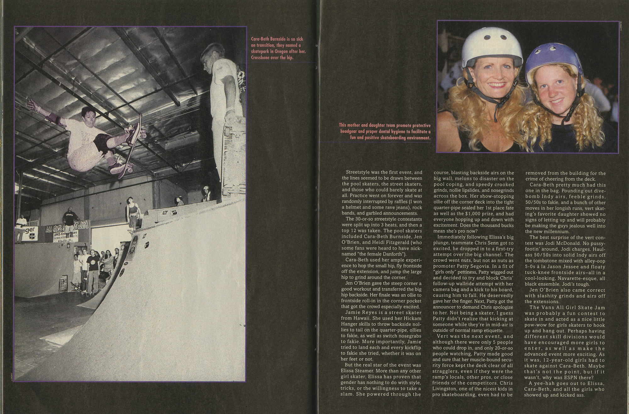 A fantastic feature called “Not Just Boys’ Fun Anymore: the growing girls revolution in skateboarding” was written in the May/June 1998 issue of Punk Planet (25) by Dan Sinkler all about the state of women’s skateboarding, with a significant interview with Patty that gave even more insight into the Reno event and how CB was ostracized. “We were invisible. We weren’t welcomed. It wasn’t an open-armed thing. It was definitely ‘You don’t belong here.’ It wasn’t a good thing. That in turn made me start taking photographs of Cara-Beth and filming her and just trying to get her out there and into the limelight to give her the acknowledgement and respect she deserved.” She also wanted the AGSJ to be an opportunity for little girls to witness CB, Jen O’Brien and Jodi McDonald “and let them come to a place and see these girls just rip and go off.”